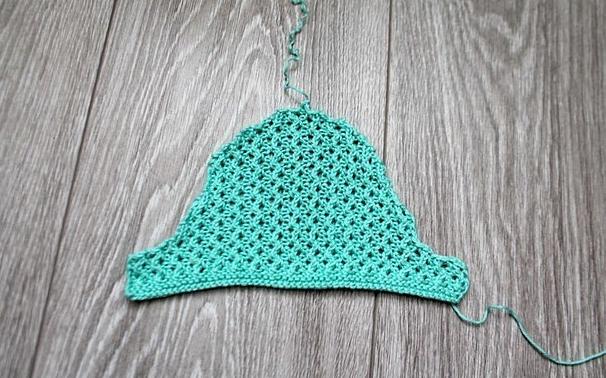 Связала по кругу 10 рядов (2см), затем разделила на переднюю (78 петель) и заднюю (75 петель) части и вязала раздельно. Для вывязывания проймы убавила последовательно с каждой стороны 2-2-1-1-1-1-1-1 петель (итого перед сократился на 20 петель и стал шириной 21 см, 58 петель). Далее провязываем без убавлений 42 ряда (10 см). Для вывязывания горловины закрываем центральные 14 петель и затем с каждой стороны 2-1-1-1-0-1-0-1-0-1, итого на плечах осталось по 14 петель. Провязываем прямо 7 рядов и закрываем петли. Высота лифа получилась где-то 61 ряд, 14 см