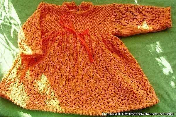 Для маленькой девочки весёлое платьице. Узор зубчикиk(нечетное число п.): 1-й - 4-й р.: лиц. гладью; 5-й р.: 1 лиц. п., *1 н., 2 п. вместе лиц.*, повт. от * до *; 6-й р.: изн. п.; 7-й 10-й р.: лиц. гладью. Узор пагода Аk(число п. в раппорте 8 1): 1-й, 5-й, 9-й, 13-й и 19-й р.: *2 лиц. п., 1 н., 2 п. вместе с наклоном влево, 1 лиц. п., 2 п. вместе лиц., 1 н., лиц. п.*, повт. от * до *, 1 лиц. п.; 2-й, 6-й, 10-й и 14-й р.: 1 изн. п., *1 н., 2 п. вместе изн., 1 н., 3 п. вместе изн., 1 н., 2 п. вместе изн. скрещ., 1 н., 1 изн. п.*, повт. от* до*; 3-й, 7-й, 11-й и 15-й р.:*2 лиц. п., п. вместе с наклоном влево, 1 н.,1 лиц. п., 1 н., 2 п. вместе лиц., 1 лиц. п.*, повт. от * до *, 1 лиц. п.; 4-й, 8-й, 12-й и 16-й р.:1 изн. п., *1 изн. п., 2 п. вместе изн., 1 н.,1 изн. п., 1 н., 2 п. вместе изн. скрещ., 2 изн. п.*, повт. от * до *; 17-й р.:*1 лиц. п., 1 н., 2 п. вместе с наклоном влево, 3 лиц. п., 2 п. вместе лиц., 1 н.*, повт. от * до *, лиц. п.; 18-й, 20-й и 22-й р.: изн. п.; 21-й р.: *3 лиц. п., 1 н., 3 п. вместе лиц. с наклоном влево, 1 н., лиц. п.*, повт. от * до *, 1 лиц. п. Узор пагода Бk(число п. в раппорте 8 1): 1-й, 3-й, 11-й и 13-й р.: *1 лиц. п., 2 п. вместе с наклоном влево, (1 лиц. п., 1 н.) 2 раза, 1 лиц. п., 2 п. вместе лиц.*, повт. от * до *, 1 лиц. п.; 2-й р. и все четные р.: изн. п.; 5-й и 15-й р.: *1 лиц. п., 1 н., 2 п. вместе с наклоном влево, 3 лиц. п., 2 п. вместе лиц., 1 н.*, повт. от* до*, 1 лиц. п.; 7-й и 17-й р.: *2 лиц. п., 1 н., 2 п. вместе с наклоном влево, 1 лиц. п., 2 п. вместе лиц., 1 н., лиц. п.*, повт. от * до *, 1 лиц. п.; 9-й и 19-й р.: *3 лиц. п., 1 н 3 п. вместе лиц. с наклоном влево, 1 н., лиц. п.*, повт. от * до *, 1 лиц. п.; 21-й р.: лиц. п. Повт. 122 р. Спинка: на спицы 3 набрать 107 п. и вязать 10 р. = 3 см узором зубчикиk. Продолжать 22 р. узором пагода Аk, вязать с обеих сторон 1 кром. п., 2 р. лиц. гладью, потом узором пагода Бk, провязывая с обеих сторон 1 кром. п. На высоте 21,5 см от края планки = 78 р. вя]зать 2 р. лиц. гладью, распределяя в первом р. 45 убавлений (= 62 п.). Продолжать жемчужным узором и в 1-м р. для разреза разделить работу на две части после 33-й п.; нитью другого цв. набрать новые 4 п. и вязать 29 п. левой части; закончить обе части отдельно. На высоте 1,5 см от начала разреза =6 р. на разрезе правой части после 2 крайних п. выполнить петлю для пуговицы, потом еще 2 на расстоянии 18 р. друг от друга (вязать 2 п. вместе лиц. и 1 н.). На высоте 2 см от начала разреза = 8 р. для проймы закрыть с обеих сторон в каждом 2-м р. 4 п. 1 раз и 2 п. На высоте 9 см от начала проймы = 38 р. закрыть оставшиеся 27 п. каждой части. Перед: начинать и вязать, как спинку. На высоте 21,5 см от края планки = 78 р. вязать 2 р. лиц. гладью, распределяя в первом ряду 44 убавле]ния (= 63 п.). Продолжать жемчужным узором. На высоте 2 см от начала кокетки = 8 р. для проймы закрыть с обеих сторон в каждом 2-м р. 4 п. 1 раз и 2 п. На высоте 6 см от начала проймы = 26 р. для выреза горловины закрыть 13 средних п. и закончить обе части отдельно, за-крывая со стороны выреза горловины в каждом 2-м р. 2 п. 1 раз и 1 п. 2 раза. На высоте 3 см от начала выреза горловины = 12 р. закрыть оставшиеся 15 п. плеч. Рукава: на спицы 3 набрать 35 п. и вязать 10 р. = 3 см узором зубчики. Продолжать 14 р. узором пагода Аk, провязывая с обеих сторон 1 кром. п. (начать с 9-го р. узора), 2 р. лиц. гладью, потом узором пагода Бk. На высоте 3 см от края планки = 12 р. прибавить с обеих сторон в каждом 6-м р. 1 п. 7 раз, вязать прибавленные п. сначала лиц. гладью, потом, как только позволит количество петель, узором пагода Бk. На высоте 16 см от края планки = 58 р. для оката закрывать с обеих сторон в каждом 2-м р. 2 п. 3 раза. На высоте 1,5 см от начала оката = 6 р. закрыть оставшиеся 37 п. СБОРКА Выполнить плечевые швы. 
