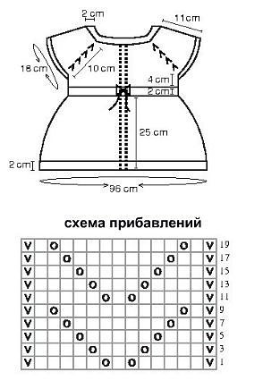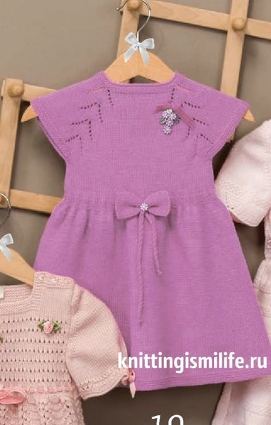 ВЯЗАНИЕ СПИЦАМИ ДЛЯ ДЕВОЧЕК ПЛАТЬЕKlubokhttp://klubok.work/23/186/7405/Klubokhttps://klubok.work/css/image/top-logo-en.pngВязаное спицами платьице с ажурными линиями реглана для девочки до года. Модель выполняется сверху вниз, поворотными рядами (туда – назад), сзади застегивается на пуговицах от верха к низу. Пряжа Ninni Bebe Nako (100 % акрил; 425м/50г) – 1 моток. Спицы № 2,5. 17 пуговиц. Начинаем вязание с горловины. Набрать 78 петель и не соединяя в круг провязать 2 ляда лицевой гладью, затем 3 ряда платочной вязкой. Следующий ряд петли распределить следующим образом: 6 петель платочной вязкой, 10 петель лицевой глади (это часть спинки), прибавить 1 петлю делая накид, 1 лицевая петля, прибавить 1 петлю делая накид, 10 петель лицевой глади (это петли для рукава), прибавить петлю делая накид, 1 лицевая петля, прибавить 1 петлю, 22 петли лицевой глади (это петли переда), прибавить 1 петл делая накид, 1 лицевая петля, прибавить 1 петлю делая накид, 10 петель лицевой глади (это петли рукава), прибавить 1 петлю делая накид, 1 лицевая петля, прибавить 1 петлю делая накид, 10 петель лицевой глади, 6 петель платочной вязки. Вязать далее в установленном порядке лицевой гладью, одновременно выполняя схему с прибавлениями для реглана 2 раза с 1 – го по 19 – й ряд = 238 петель в работе (приблизительно 10 см). После 50 петель каждого рукава провязать платочной вязкой 1 см и эти петли закрыть. Далее вяжем перед и спинку вместе, одной деталью (вязание сзади не соединяем), лицевой гладью и по краям по 6 петель платочной вязки. Провязать 4 см, затем вязать резинкой 2 лиц х 2 изн. 3 см. В следующем ряду сделать прибавления через 1 петлю = 276 петель и вязать 23 см, затем провязать платочной вязкой 2 см петли закрыть. Сделать 9 петель для пуговиц на расстоянии 3 см друг от друга на правой стороне спинки. Остальные 7 пуговиц пришить впереди (смотрите фото) в качестве декора и одну пришить на бант. Вяжем бант: Набрать 24 петли и провязав 2 см платочной вязкой закрыть петли. Стянуть, сформировав с помощью нитки бант посередине, пришить бант на центр пояса и пришить пуговицу. Сделать шнур длиной 20 см и пришить к банту, как показано на фото.