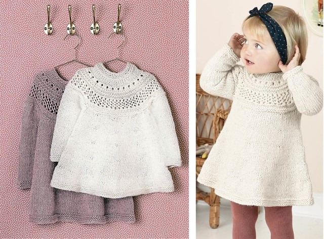 Платье с ажурной кокеткой для девочкиKlubokhttp://klubok.work/23/186/7728/Klubokhttps://klubok.work/css/image/top-logo-en.pngПлаточная вязка Лицевые и изнаночные ряды – лицевые петли; в круговых рядах вязать попеременно 1 круг.р. изнаночными, 1 круг.р. лицевыми. Лицевая гладь Лицевые ряды – лицевые петли, изнаночные ряды – изнаночные петли; в круговых рядах все петли вязать лицевыми. Прибавка 1 п. Из поперечной нити между двумя петлями связать 1 лиц. скрещенную. Плотность вязания 16 п. лицевой глади = 10 см. Внимание! Платье вяжется, начиная от горловины. Выполнение работы Кокетка На круговые спицы № 5 набрать 35 (35) 39 п. и связать 3 р. платочной вязкой прямыми рядами. Перейти на круговые спицы № 5,5 и вязать следующим образом: 1-й р. (на изнаночной стороне): все лицевые; 2-й р.: * 2 лиц., прибавить 1 п. *, от * до * постоянно повторять и закончить ряд 1 лиц. (= 52 (52) 58 п.); 3-й р.: все лицевые; с 4-го по 10-й р.: вязать лицевой гладью; 11-й р.: все лицевые; 12-й р.: 1 лиц., * 1 накид, 2 лиц. *, от * до * постоянно повторять и закончить ряд 1 накидом и 1 лиц. (= 78 (78) 87 п.); 13-й и 14-й р.: вязать лицевой гладью; 15-й р.: все лицевые; 16-й и 17-й р.: вязать лицевой гладью; 18-й р.: все изнаночные; 19-й и 20-й р.: вязать лицевой гладью; 21-й и 22-й р.: все лицевые; 23-й р.: * 3 лиц., прибавить 1 п. *, от * до * постоянно повторять и закончить ряд 3 лиц. (= 103 (103) 115 п.); с 24-го по 29-й р.: перейти на круговые спицы № 5, 1 лиц., * 1 накид, 2 п. вместе лиц. *, от * до * постоянно повторять; 30-й р.: перейти на круговые спицы № 5,5 и вязать все лицевые; 31-й р.: 1 лиц., *прибавить 1 п., 4 лиц.*, от * до * постоянно повторять и закончить ряд 3 лиц. (= 128 (128) 143 п.); с 32-го по 34-й р.: вязать лицевой гладью; 35-й р.: все лицевые; 36-й р.: все изнаночные, при этом равномерно прибавить 8 (18) 13 п. (= 136 (146) 156 п.). Затем связать 1 (3) 5 круг.р. лицевой гладью и разделить работу следующим образом: начиная от середины спинки, связать 18 (20) 22 п. (первая половина спинки), отложить следующие 32 (33) 34 п. (первый рукав), связать 36 (40) 44 п. (перед), отложить 32 (33) 34 п. (второй рукав) и связать 18 (20) 22 п. (вторая половина спинки). Спинка и перед На 80 (88) 96 п. вязать круговыми рядами лицевой гладью; прикрепить маркеры на каждую 10 (11) 12-ю петлю (= 8 равных сегментов) и через каждые 4 см прибавить с обеих сторон от каждого маркера 5 (6) 7 х 1 п. (= 160 (184) 208 п.). Далее вязать без прибавлений, через 36 (40) 46 см от начального ряда (или за 2 см до нужной длины платья, измеряя по переду) перейти на круговые спицы № 5, связать 6 круг.р. платочной вязкой и закрыть все петли. Рукава Переснять отложенные петли рукава на чулочные спицы № 5,5, при этом для проймы набрать дополнительно 4 петли (по 2 п. с каждой стороны = 36 (37) 38 п.). Вязать лицевой гладью круговыми рядами. Прикрепить маркеры на первую и последнюю петли кругового ряда и через каждые 3 (3,5) 4 см с обеих сторон от отметок убавлять по 1 п., пока на спицах не станет 24 (25) 26 п. Далее вязать без убавлений, через 21 (24) 27 см от начального ряда (или за 2 см до нужной длины рукава) перейти на чулочные спицы № 5, связать 6 круг.р. платочной вязкой и закрыть все петли. Так же связать второй рукав. Сборка Сшить края разреза на спинке примерно до середины длины. Крючком обвязать свободные края разреза на спинке 1 р. ст. б/н, связав в верхнем углу одной из сторон цепочку из нескольких в.п., чтобы получилась навесная петля. Пришить пуговицу.