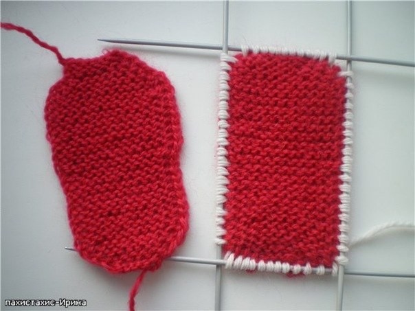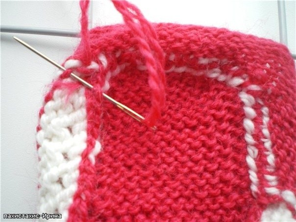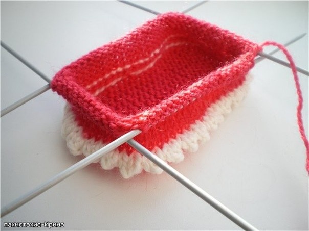 Красной ниткой 6 рядов, чередуя лицевые и изнаночные ряды. Красную нитку обрезать, оставив длинный конец. Им потом пришить ушки к основе.