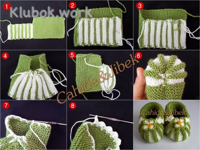 Расход ниток 50гр. Набрать на прямые спицы основным цветом, обычным набором 28 петель. Провязать платочной вязкой 52 ряда (размер пинетки варьируется кол-вом провязанных рядов). Затем закрыть с правой стороны в один прием 8 петель. Количество петель равно 20. Далее продолжить вязание вторым цветом: выполнить 4 ряда лицевой гладью, 4 ряда изнаночной вязкой. Повторить раппорт 7 раз, закончить лицевыми петлями. Закрыть петли в один прием.