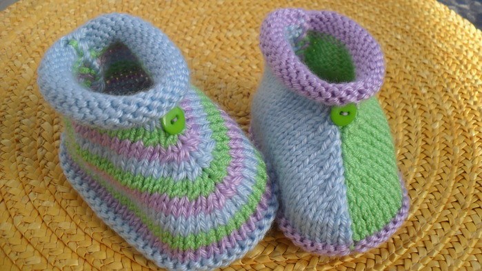 Пинетки Набрать сиреневой нитью 40 п.,провязать 1 ряд изн.п.. Затем сделать прибавления в каждом 2-м р.: * 2 л.п,накид,16 л.п.,накид,4 л.п.,накид,16 л.п.,накид,2 л.п.. * 3 л.п.,нак.,16 л.п.,нак.,6.л.п.,нак.,16 л.п.,нак.,3.л.п.. * 4 л.п.,нак.,16.л.п.,нак.,8.л.п.,нак.,16.л.п.,нак.,4.л.п.. * 5.л.п.,нак.,16.л.п.,нак.,10.л.п.,нак.,16.л.п.,нак.,5.л.п.. Продолжать изн.гладью эти 56 п. 3 ряда. Затем связать 28 п. бирюзовой нитью,28 п.салатовой нитью,перекрещивая нитки на изн.стороне. С 9-го р. сделать убавления в кажд.2-м р.: * 24 л.п.,2 раза одна простая протяжка,2 раза 2 петли вместе,24 л.п.. * 22 л.п.,2 раза 1 простая протяжка,2 раза 2 п. вместе,22 л.п.. * 20 л.п.,2 раза 1 простая протяжка,2 раза 2 п. вместе,20 л.п.. * 18 л.п.,2 раза 1 простая протяжка,2 раза 2 п. вместе,18 л.п.. * 16 л.п.,2 раза 1 простая протяжка,2 раза 2 п. вместе,16 л.п.. Остаётся 36 п..Продолжать сиреневой нитью лиц. гладью 8 р..Закрыть петли.