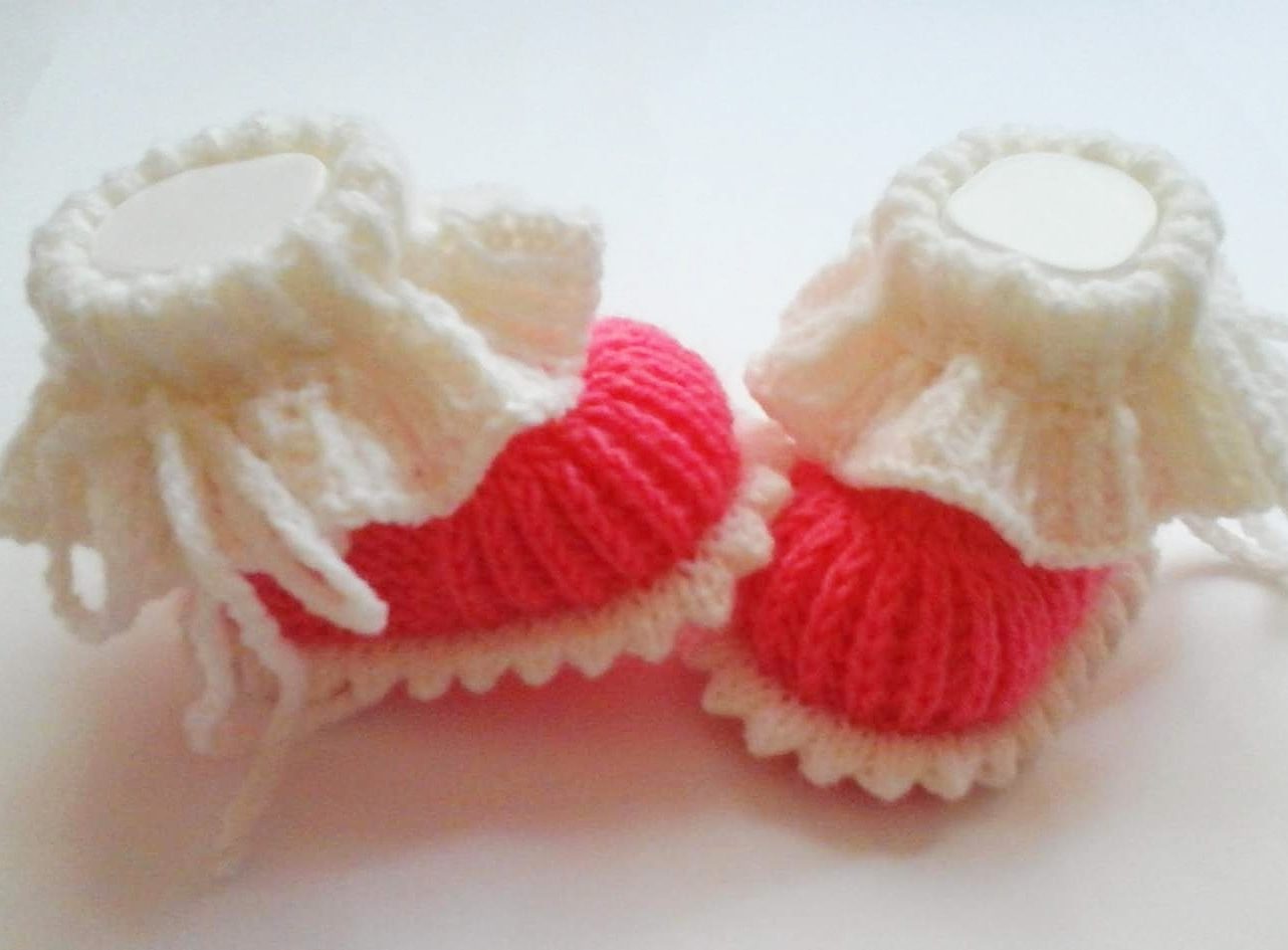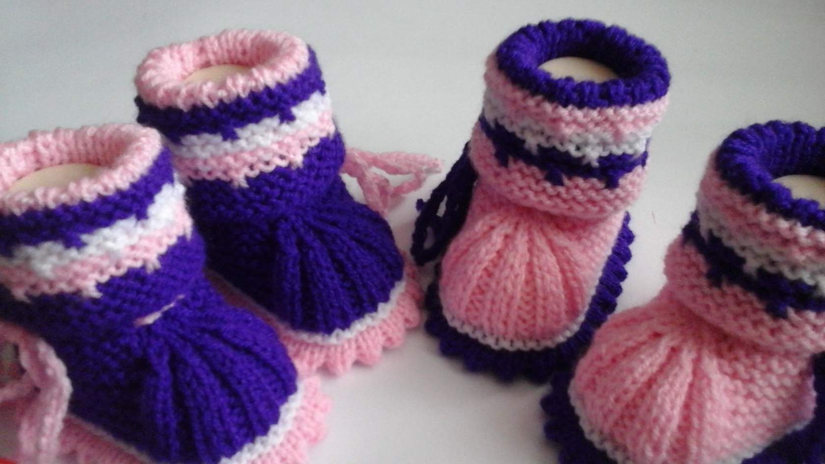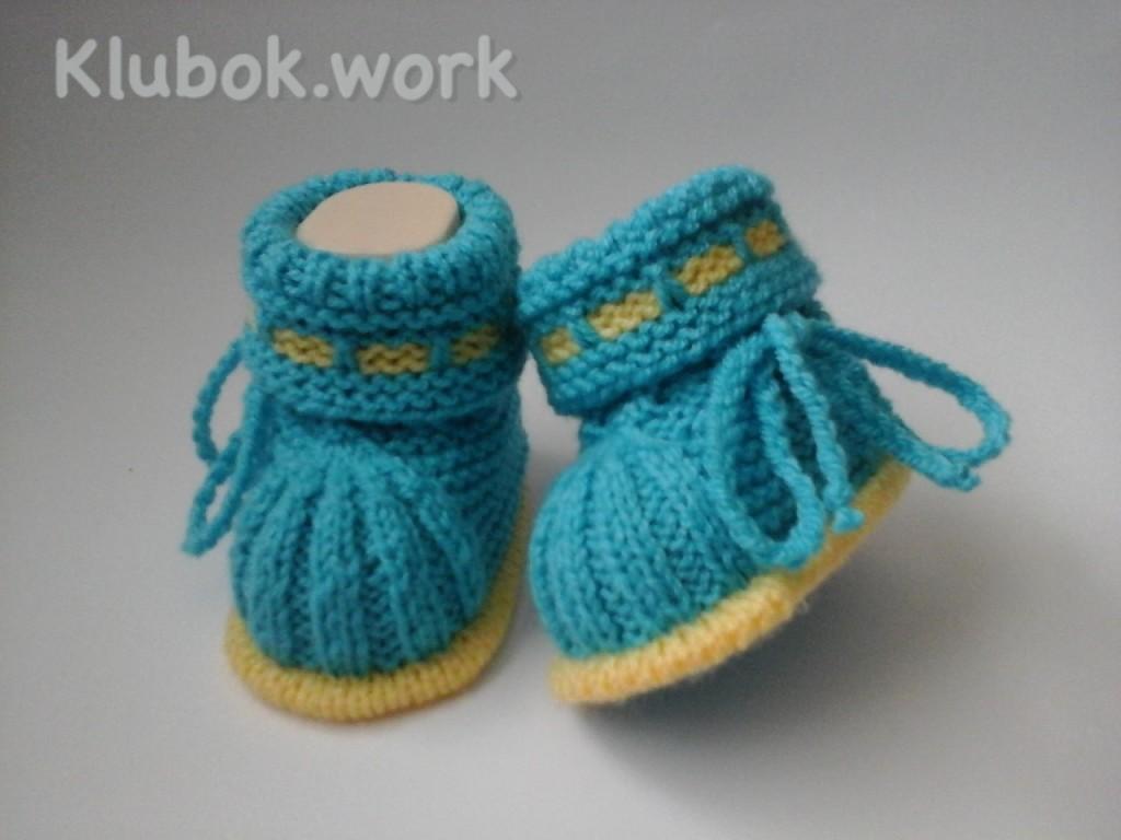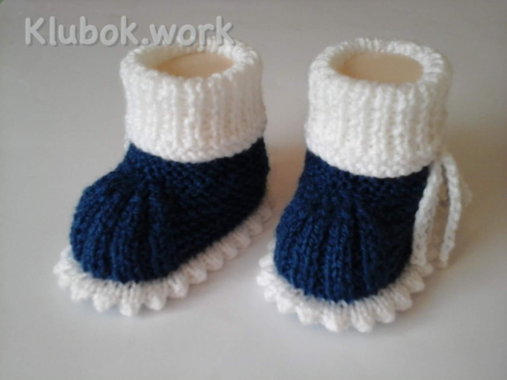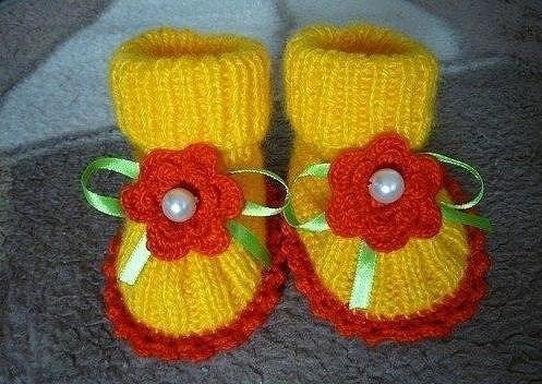 Виды вязки – 1) «платочная» (все петли лицевые) 2) резинка 2х2 (2 лицевые, 2 изнаночные петли) 3) резинка 1х1 (1 лицевая, 1 изнаночная) Начинаем вязать с середины подошвы. Подошва вяжется платочной вязкой. На спицы набрать 40 петель. 1-й и 2-й ряд – все петли лицевые. Начиная с 3-го ряда надо прибавлять в каждом втором ряду 4 раза по 4 петли (по одной петле по краям и две петли в середине). Новую петлю добавляем из перетяжек между петель. Перетяжку перед провязыванием нужно перекрутить, чтобы не образовалась дырка и вязание было плотнее. Перетяжку между петель поднимаем, перекручиваем и провязываем. 3-й ряд – 1 кромочная, 1 петлю прибавить лиц., 18 лиц., 1п. прибавить лиц., 2 лиц, 1 прибавить лиц., 18 лиц., 1 прибавить лиц., 1 кромочная. 4-й ряд – все лицевые. 5-й ряд - 1 кромочная, 1 лиц., 1 петлю прибавить лиц., 18 лиц., 1п. прибавить лиц., 4 лиц, 1 прибавить лиц., 18 лиц., 1 прибавить лиц., 1 лиц, 1 кромочная. 6-й ряд – все лицевые. 7-й ряд - 1 кромочная, 2 лиц., 1 петлю прибавить лиц., 18 лиц., 1п. прибавить лиц., 6 лиц, 1 прибавить лиц., 18 лиц., 1 прибавить лиц., 2 лиц, 1 кромочная. 8-й ряд – все лицевые. 9-й ряд - 1 кромочная, 3 лиц., 1 петлю прибавить лиц., 18 лиц., 1п. прибавить лиц., 8 лиц, 1 прибавить лиц., 18 лиц., 1 прибавить лиц., 3 лиц, 1 кромочная. 10-й, 11-й и 12-й ряды – все петли лицевые. Всего прибавлено 16 петель. На спицах теперь 56 петель. Подошва готова. Делим петли на 3 части – две боковые и средняя часть. Боковые части вяжутся платочной вязкой, средняя – резинкой 2х2. Петли надо рассчитать так, чтобы средняя часть пинетки начиналась и заканчивалась двумя лицевыми петлями. В моём примере получилось – средняя часть 18 петель и две боковые части по 19 петель, включая кромочную петлю. 1-й ряд – 1 кромочная, 18 лицевых, 18 петель резинкой 2х2 (2лиц, 2изн, 2лиц, 2изн, 2лиц, 2изн, 2лиц, 2изн, 2лиц), 18 лицевых, 1 кромочная. 2-й ряд - 1 кромочная, 18 лицевых, 18 петель резинкой 2х2 уже по рисунку (2изн, 2лиц, 2изн, 2лиц, 2изн, 2лиц, 2изн, 2лиц, 2изн), 18 лицевых, 1 кромочная. 1-й и 2-й ряд повторить ещё 5 раз. Теперь после подошвы провязано 12 рядов. Со следующего 13-ого ряда начинаем делать убавления. 13-ряд - 1 кромочная, 18 лицевых, 2 вместе лицевой, 2 вместе изнаночной, 2 вместе лицевой, 2 вместе изнаночной, 2 вместе лицевой, 2 вместе изнаночной, 2 вместе лицевой, 2 вместе изнаночной, 2 вместе лицевой, 18 лицевых, 1 кромочная. Петли при убавлении провязывать так, чтобы они не были перекрученными. Тогда рисунок будет ровным. 14-й ряд - 1 кромочная, 18 лицевых, 1 изн, 1 лиц, 1 изн, 1 лиц, 1 изн, 1 лиц, 1 изн, 1 лиц, 1 изн, 18 лицевых, 1 кромочная. 15-й ряд - 1 кромочная, 18 лицевых, следующие 1лиц и 1 изн петли провязать вместе лицевой, 2 вместе лицевой, 2 вместе лицевой, 2 вместе лицевой, 2 вместе лицевой (1 петля от резинки и 1 петля от боковой части – «платочной» вязки» ), 17 лицевых, 1 кромочная. 16-й ряд - 1 кромочная, 17 лицевых, 5 изнаночных, 18 лицевых, 1 кромочная. 17-й ряд - 1 кромочная, 18 лицевых, 2 вместе лицевой, 1 лицевая, 2 вместе лицевой, 17 лицевых, 1 кромочная. 18-й, 19-й, 20-й ряды – все петли лицевые. Далее вяжем резинкой 1х1 24 ряда. Петли закрыть. Нить оборвать, оставив 20-25 см для сшивания. Сшиваем вертикальным трикотажным швом (сшиваем по лицевой стороне, а шов остаётся на изнаночной стороне) Начать сшивать пинетку нужно с изнаночной стороны, чтобы на отвороте пинетки шов оказался на изнаночной стороне. Сшить примерно 3/4 резинки 1х1. Выворачиваем на правую сторону и продолжаем сшивать до конца Оформляем пинетки по своем