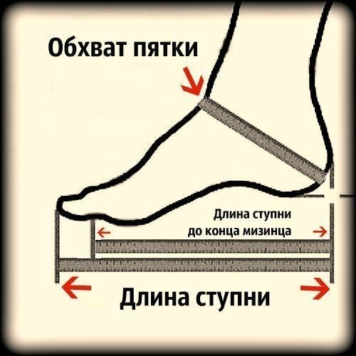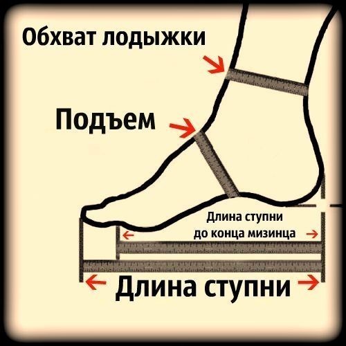 Этот способ для взрослых и детей побольше . «Обхват лодыжки» и «Подъем» (см. второй рисунок) Эти две мерки складываем и делим пополам , при необходимости прибавляем 1-2 см для свободы облегания. Например: «Обхват лодыжки» 14 см. «Подъем» 15,5 см. (14 см + 15,5 см) : 2 = 14,75 см 14,75 см + 2 см на свободу облегания = 16,75 см (почти 17 см) 2 мерка. Длина ступни от пятки до конца мизинца. Например: 10 см. 3 мерка. Длина ступни от пятки до конца большого пальца. Например: 12,5 см. Просто снимите три мерки с ножки и запишите на листочек. Я еще записываю: чья эта мерка, возраст, нитки, номер спиц. Свои замеры пишите так : --------------------------------------------- 1. Обхват (Способ 2) = 2. Длина ступни до конца мизинца = 3. Длина ступни = Делаем расчет петель : Связаный образец слегка отпарьте 4. Считаем количество петель в 1 см Прикладываем к образцу линейку , чтобы деление «0» было точно между петель .