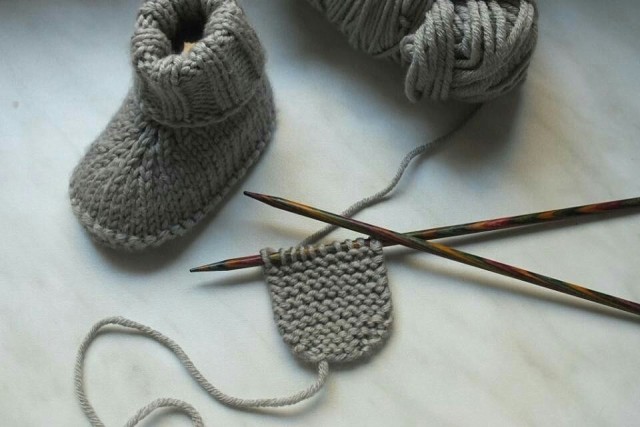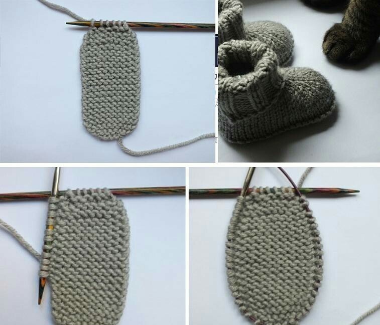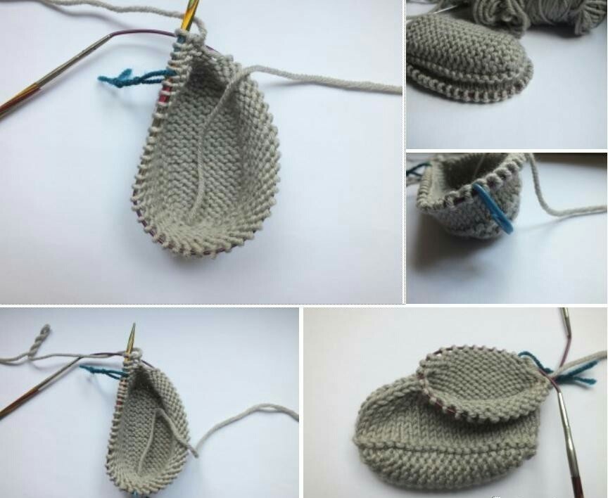 1-й ряд (изн. сторона): лицевые петли. 2-й ряд (лиц. сторона): 1 лиц., прибавить петлю, 4 лиц., прибавить петлю, 1 лиц. = 8 петель. 3-й ряд: лицевые петли. 4-й ряд: 1 лиц., прибавить петлю, 6 лиц., прибавить петлю, 1 лиц. = 10 петель. 5-33 ряды: вязать лицевыми петлями (платочная вязка). 34-й ряд: 1 лиц., 2 вместе лиц. вправо, 4 лиц., 2 вместе лиц. влево, 1 лиц. = 8 петель. 35-й ряд: лицевые петли. 36-й ряд: 1 лиц., 2 вместе лиц. вправо, 2 лиц., 2 вместе лиц. влево, 1 лиц. = 8 петель. 37-й ряд: лицевые петли. Подошва в длину 9 см. Поднять 40 петель равномерно вокруг подошвы: по 18 петель с каждой стороны подошвы и 4 петли вдоль наборного края = 46 петель.