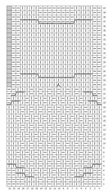 8-й ряд: снять первую петлю, 29 лицевых, 21 петля по схеме, 29 лицевых, последняя — изнаночная.