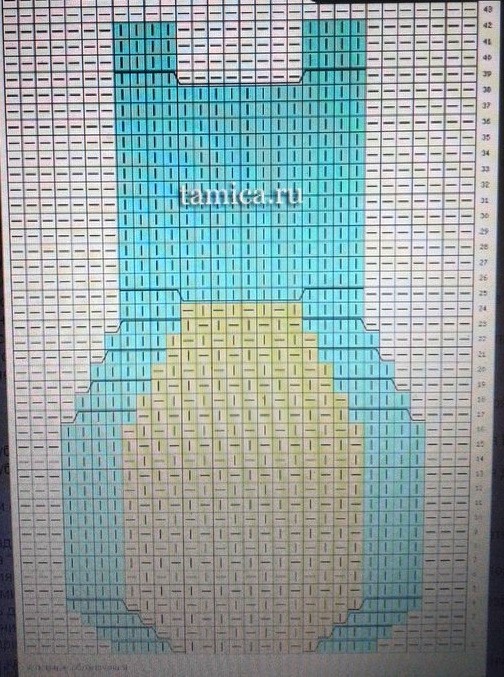 Продолжить вязание, выполняя по бокам (по 30 петель с каждой стороны) изнаночную гладь, а в центре — узор «Сова» по схеме.