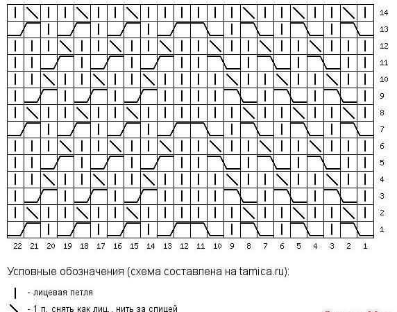 Ряды с 7-го по 12-й повторяем до 37 ряда, с 37 ряда схема меняется, так как вместо перекрещивания по краям узора начинаем убавление провязыванием по две петли с наклоном к центру узора. Схема дальнейшего вязания узора: