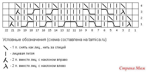 Эти 4 ряда повторяем до тех пор, пока в боковых узорах не останется две петли.