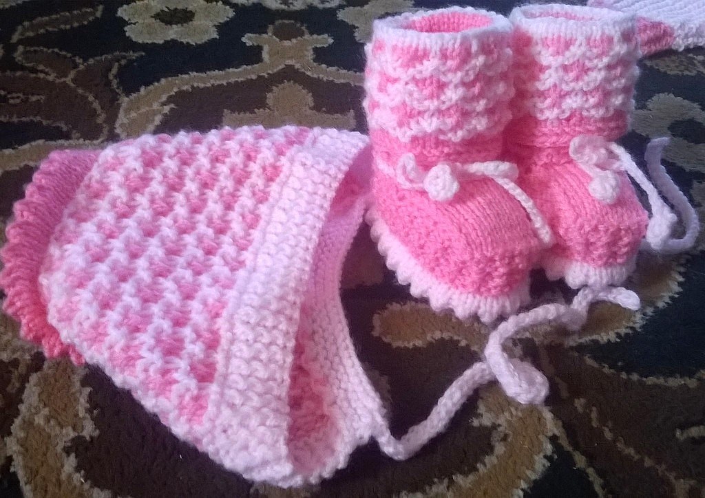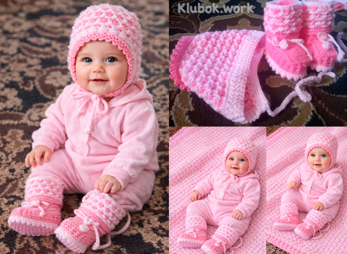 You can use different color combinations when knitting the bonnet. Instead of the “teeth,” you can make a fluffy edge along the back edge of the bonnet (option for girls). The ruffle is made with a crochet hook.
