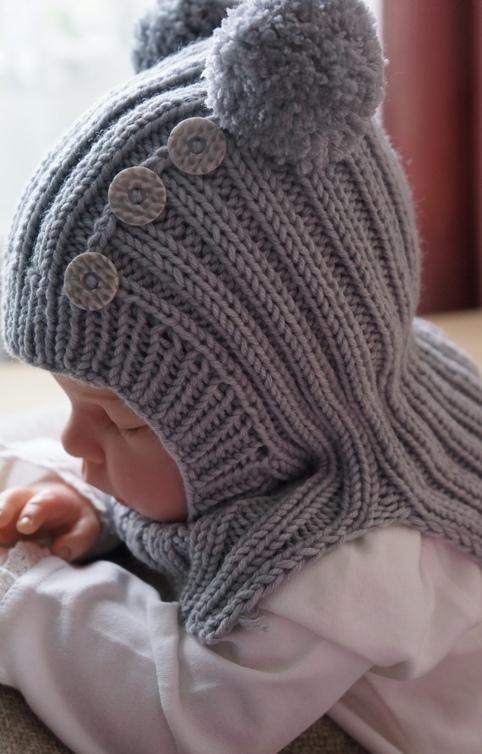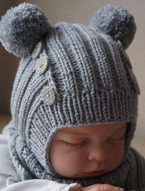 Крестообразным набором набрать 50 петель и вязать резинкой 2 на 2 30 рядов ( перед ) , петли отложить . Затем также свять на 50 петлях вторую деталь , но уже чуть длиннее 40 рядов ( спинка ) , далее обе детали замкнуть в круг и вязать по кругу 30 рядов . На передней половинке закрываем средние 18 петель и продолжаем вязание , закрывая с каждой стороны в каждом втором ряду по 2 петли 5 раз, должно остаться в работе 62 петли и вяжем высоту нашей шапочки ( примерно 15 см ) и потом , делим на три части 20 , 22, 20 петель и вяжем как пятку носка , должны на спице остаться 22 петли , затем вяжем резиночку по овалу лица 10 рядов . Сделать помпончики и пришить пуговки .