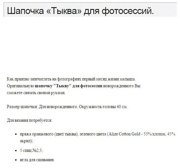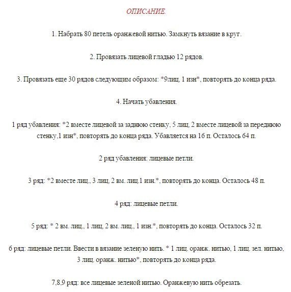Шапочки для малышейKlubokhttp://klubok.work/23/189/7579/Klubokhttps://klubok.work/css/image/top-logo-en.pngШапочки для малышей * пряжа красная акриловая, мягкая, ок 30 гр. Я брала акрил Lions Brand Vanna's Choice, 156 м/100гр темно красного цвета * немного коричневой и зеленой пряжи, любого состава * спицы 4 мм и 4,5 мм, круговые и/или носочные * петельный маркер или отрезок пряжи * игла для сшивания Инструкция: Спицами 4мм свободно набрать 54 петли, красной пряжей. Замкнуть в кольцо, отметить начало ряда маркером. Вязать резинкой 1х1 или 2х2, 9 рядов Перейти на спицы 4,5мм, вязать лицевыми, равномерно добавляя 6 петель = 60 пет. У меня было так - 4 лиц, добавочная петля (любым методом), 9лиц, добавочная, 9лиц.... Лицевыми рядами провязать всего 10 рядов Начинаем убавки. Будет делать 6 клиньев. 1ряд - *8 лиц, 2 вместе*.... 2 ряд и все четные - все лицевые 3 ряд - *7 лиц, 2 вместе*... 5 ряд - *6 лиц, 2 вместе*... так продолжать убавления пока не останется 6 петель. Обрезать пряжу, оставив хвостик ок. 10см Процесс вязания черенка. Перейти на спицы 4мм, привязать коричневую пряжу к красной. Теперь будем вязать I-cord. Первые 2 петли ряда провязать вместе, чтобы осталось 5 петель на спице. Провязать 8 рядов I-cord Нить обрезать, протянуть через все петли, стянуть, протянуть вовнутрь шапочки. Все концы скрепить. Листочек спицами. Набрать 3 петли 1 ряд - 2из1 л, 1и, 2из1 л = 5 пет 2 ряд - лиц 3 ряд - 2из1 л, 1л, 1и, 1л, 2из1 л = 7 пет 4 ряд - лиц 5 ряд - 2из1 л, 2л, 1и, 2л, 2из1 л = 9 пет 6 ряд - лиц 7 ряд - 4л, 1и, 4л 8 ряд - лиц повторить 7 и 8 ряд 3 раза ряд 15 - 1л, 2вл, 1л, 1и, 1л, 2вл, 1л = 7 пет ряд 16 - лиц ряд 17 - 1л, 2вл, 1и, 2вл, 1л = 5 пет ряд 18 - лиц ряд 19 - 2вл, 1и, 2вл ряд 20 - лиц ряд 21 - три петли вместе лицевой Нить обрезать, стянуть.