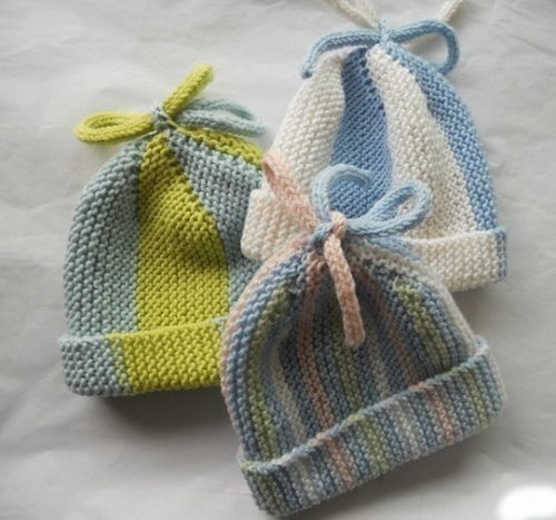 Шапочка для новорожденного спицами Klubokhttp://klubok.work/23/189/7957/Klubokhttps://klubok.work/css/image/top-logo-en.pngДля вязания шапочки нужно взять детскую пряжу состава акрил + шерсть. Длина нити примерно 110 м на 50 гр. Прямые спицы № 4. Шапка вяжется прямо на двух спицах из серии секций, выполненных в технике укороченных рядов. Секции выполняются платочной вязкой, не надо оборачивать нитью петли при развороте. Цветом А набрать 38 петель (10 петель для верхушки укороченными рядами и 30 петель для основной части шапки) РЯД1 (лицевой ряд — ЛР) = 28 лиц, (10 петель не провязано на левой спице), повернуть работу. РЯД 2 (изнаночный ряд — ИР) = 28 лиц РЯДЗ (ЛР) = 29 лиц, повернуть работу (9 петель не провязано) РЯД4 (ИР) =29 лиц РЯД5 (ЛР) = 30 лиц, повертеть работу (8 петель не провязано) РЯД6 (ИР) =30 лиц РЯД7 (ЛР) = 31 лиц, повернуть работу (7 петель не провязано) РЯД8 (ИР)= 31 лиц РЯД9 (ЛР) = 32 лиц, повернуть работу (6 петель не провязано) РЯД 10 (ИР) = 32 лиц РЯД11 (ЛР) = 33 лиц, повернуть работу (5 петель не провязано) РЯД 12 (ИР) = 33 лиц РЯД 13 (ЛР) =34 лиц, повернуть работу (4 петель не провязано) РЯД 14 (ИР) = 34 лиц РЯД 15 (ЛР) = 35 лиц, повернуть работу (3 петель не провязано) РЯД16 (ИР) = 35 лиц РЯД17 (ЛР) =36 лиц, повернуть работу (2 петель не провязано) РЯД 18 (ИР) = 36 лиц РЯД 19 (ЛР) = 37 лиц, повернуть работу (1 петля не провязана) РЯД20 (ИР) =37 лиц РЯД21 (ЛР) = 38 лиц Закончена одна секция. РЯД22 (ИР) = присоединить нить Б, 38 лиц. Повторить ряды 1 -22 еще 4 раза По окончанию 5 секций повторить еще раз ряды 1-21. Закрыть петли в следующем ряду. Сшить задний шов. Бантик Цветом А поднять на макушке шапочки 4 петли связать полый шнур I-Cord около 20 см. Повторить цветом Б. Завязать бантик.