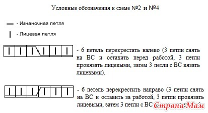 6 вправо - 6 петель перекрестить направо (3 петли снять на ВС и оставить за работой, 3 петли провязать лицевыми, затем 3 петли с ВС вязать лицевыми).