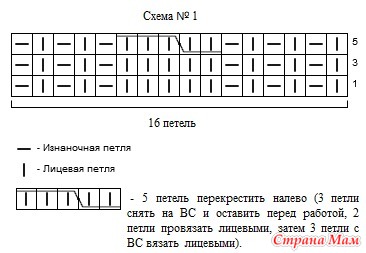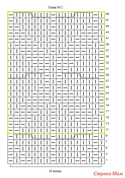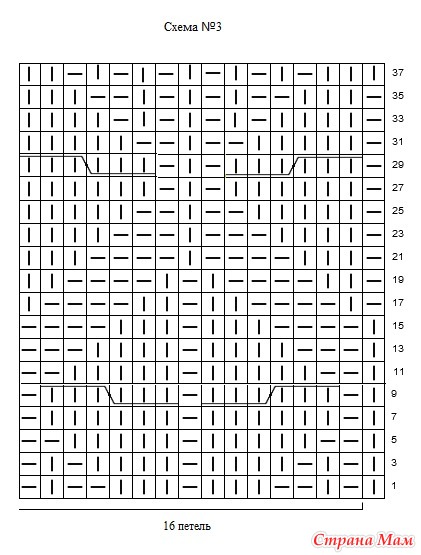 Ряды 1-6 повторить 3 раза (высота 4,5см). Перейти к схеме №2. Раппорт узора в ширину 16 петель, повторяется 9 раз.