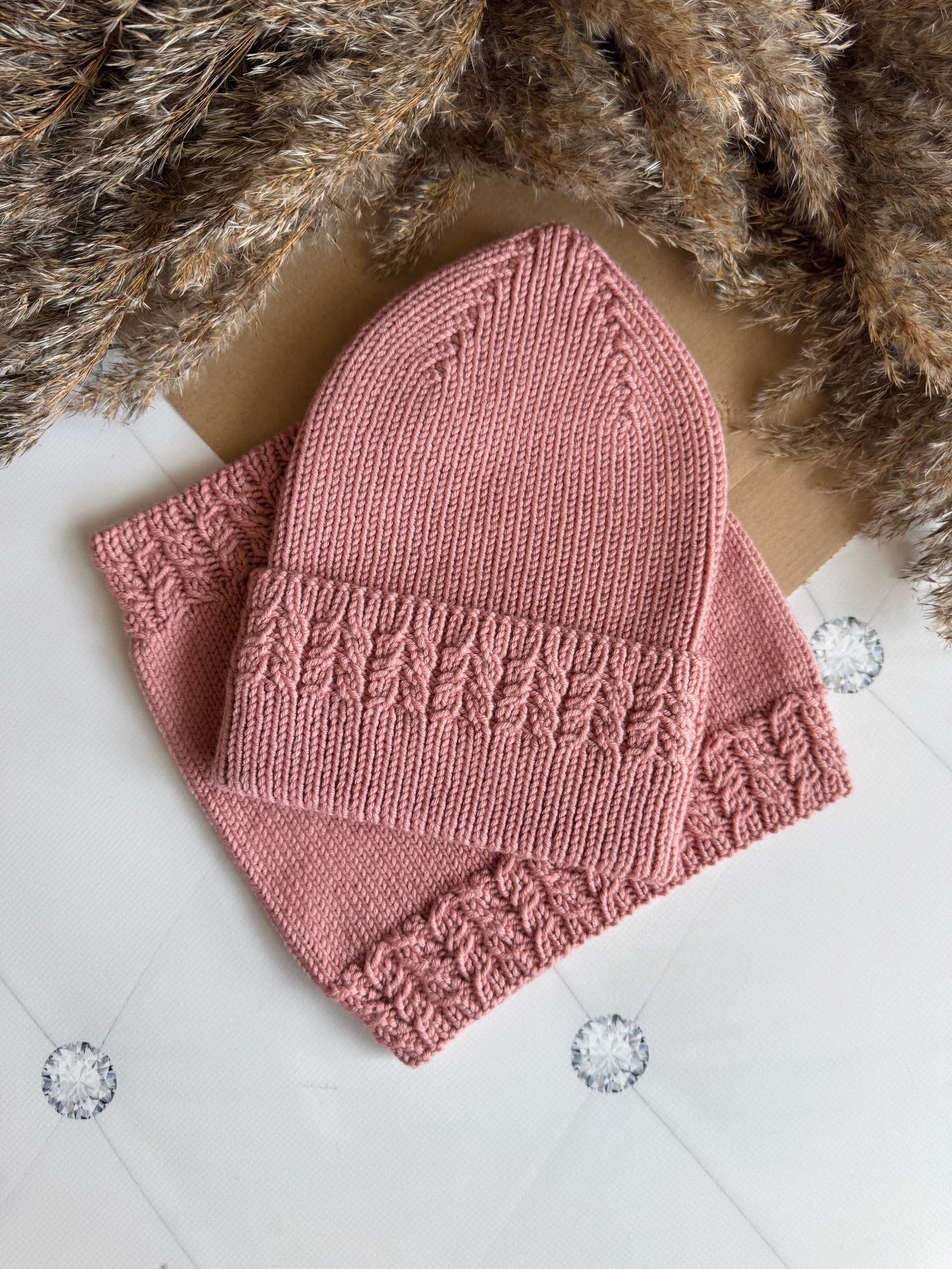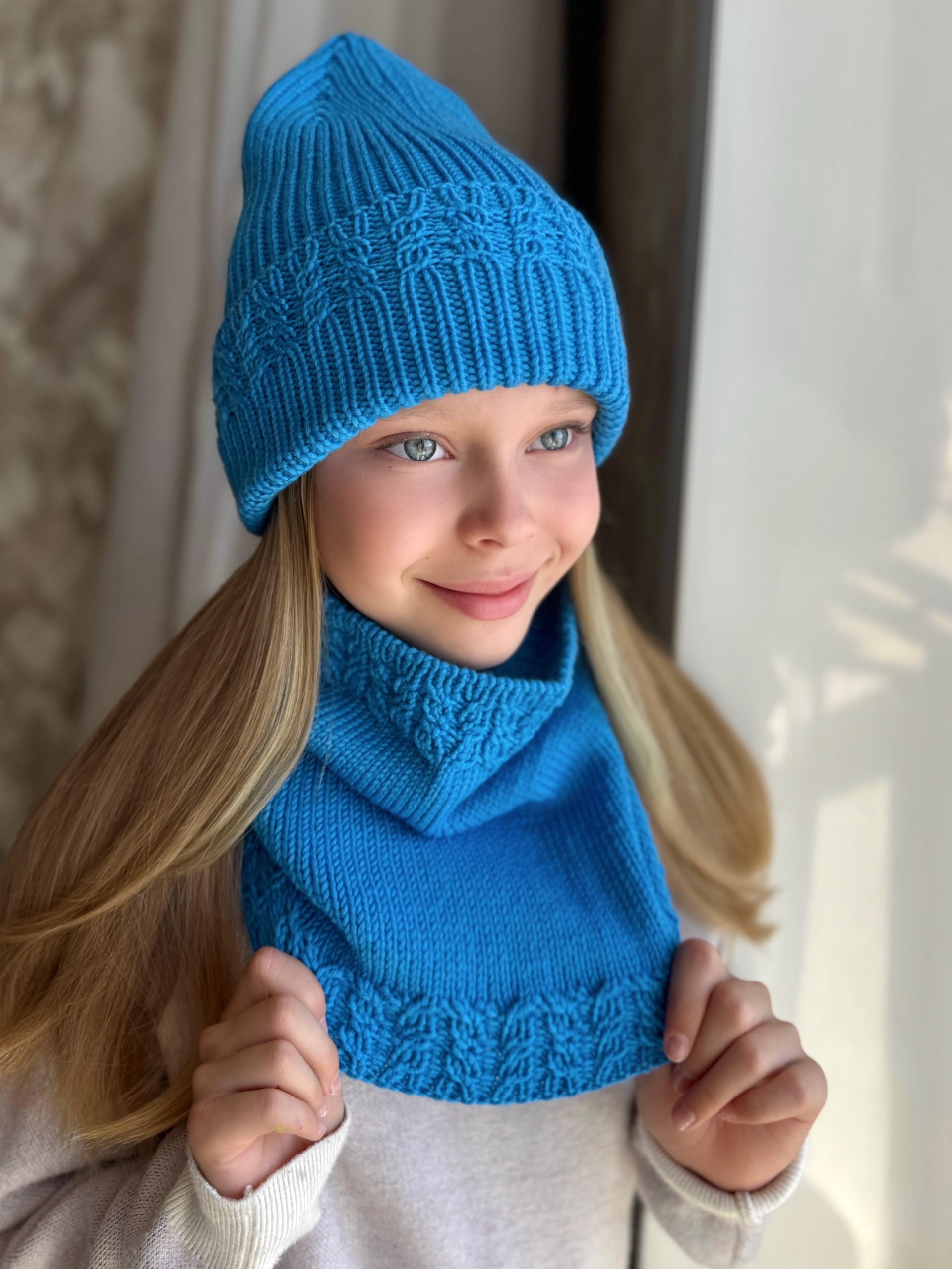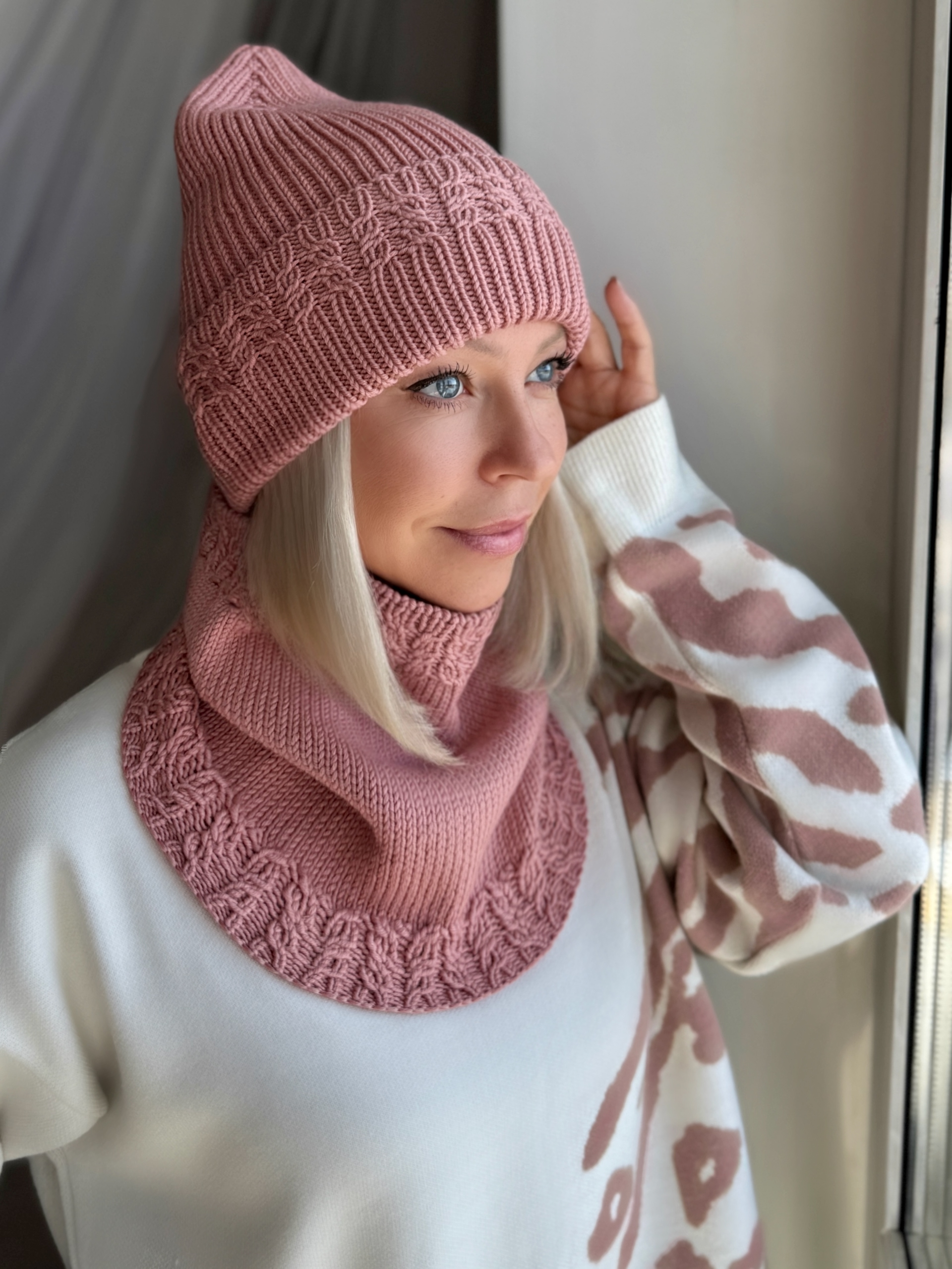 Спицами номер 3,5 — шапка, номер 4 и 4,5 — снуд.