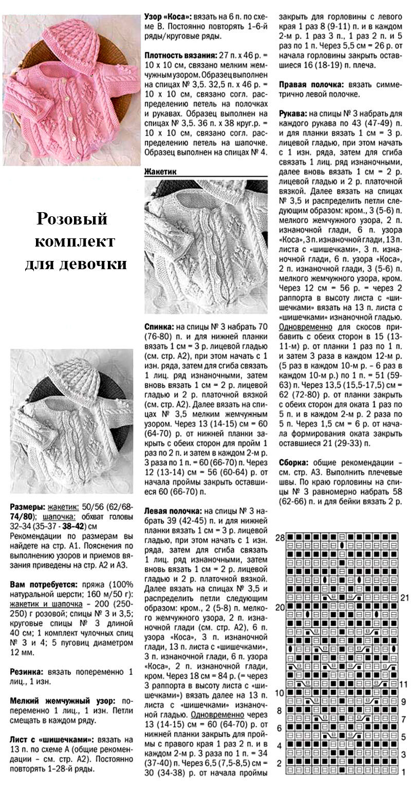 Вам потребуется: пряжа (100% натуральной шерсти; 160 м/50 г): жакетик и шапочка – 200 (250-250) г розовой; спицы № 3; круговые спицы № 3 длиной 40 см; спицы с крупными ушками для сшивания; 5 пуговиц диаметром 20 мм.