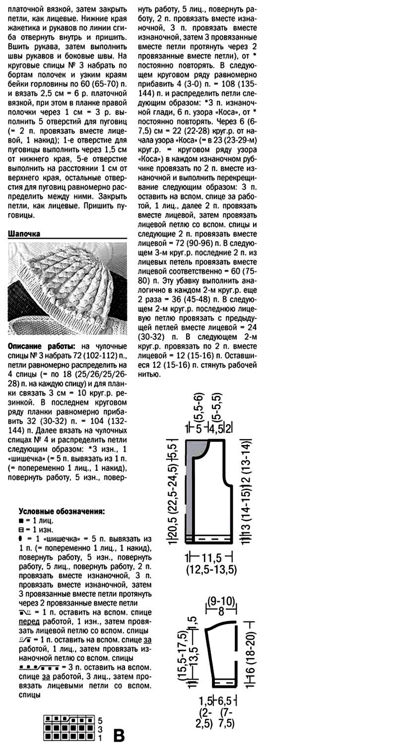 Плотность вязания: 27 п. х 46 р. = 10 х 10 см, связано мелким жемчужным узором. Образец выполнен на спицах № 3,5. 32,5 п. х 46 р. = 10 х 10 см, связано согласно распределению петель на полочках и рукавах. Образец выполнен на спицах № 3,5. 36 п. х 38 круг. р. = 10 х 10 см, связано согласно распределению петель на шапочке. Образец выполнен на спицах № 4.