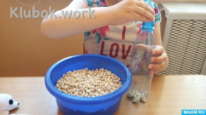 "Игра "Аквариум" Игрушки: банка с водой, мел и пластмассовые предметы (пуговицы, мозаика, фишки, шарики), поварешка, ложка с длинной ручкой, дуршлаг (ложка с дырочками). Мелкие предметы бросают в сосуд, беря их тремя пальцами то правой, то левой руки. После того, как аквариум заполнен, рыбок можно половить. Ребенку дается возможность попробовать все предметы в качестве "сачка", причем вытаскивать нужно не помогая другой рукой.