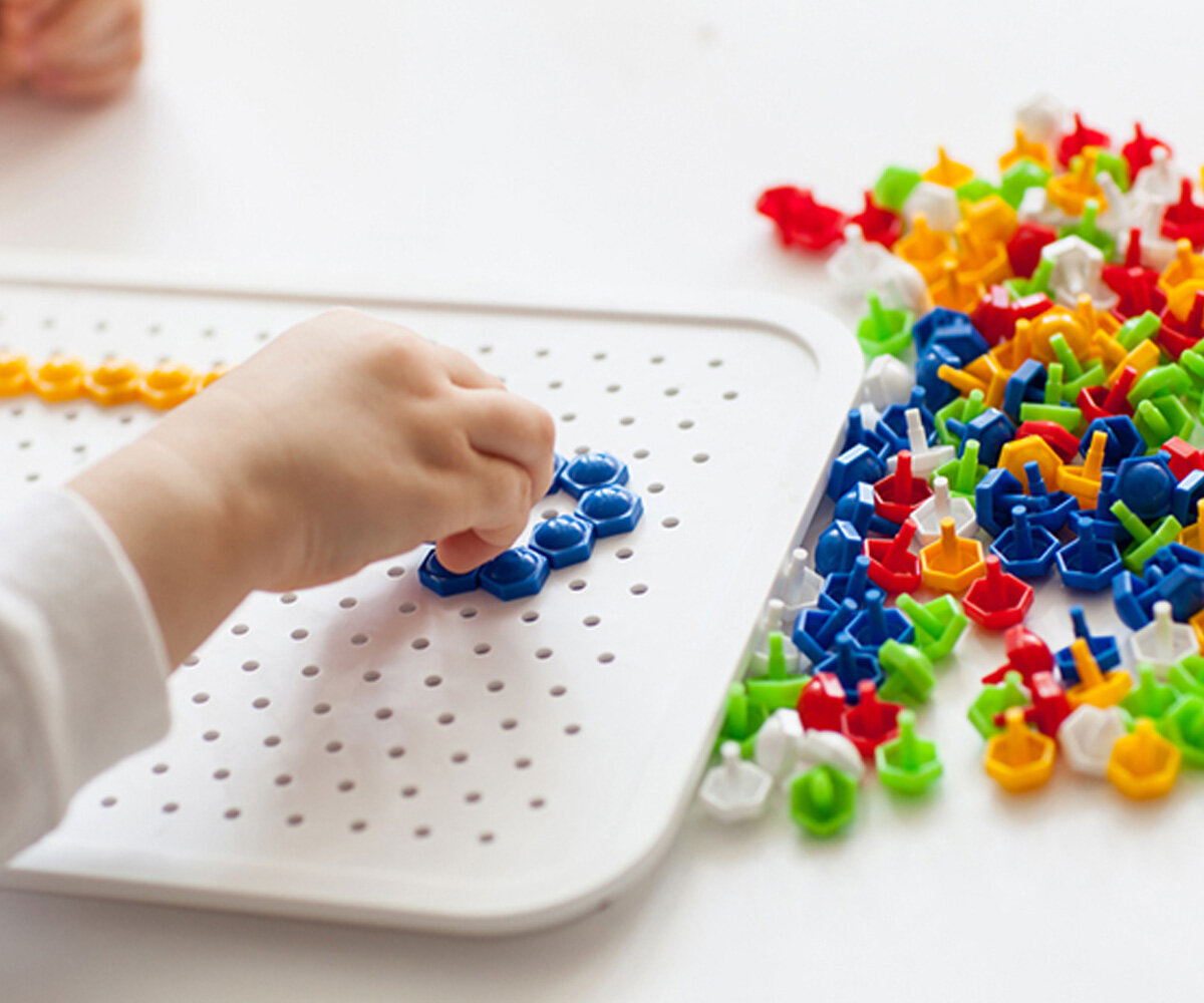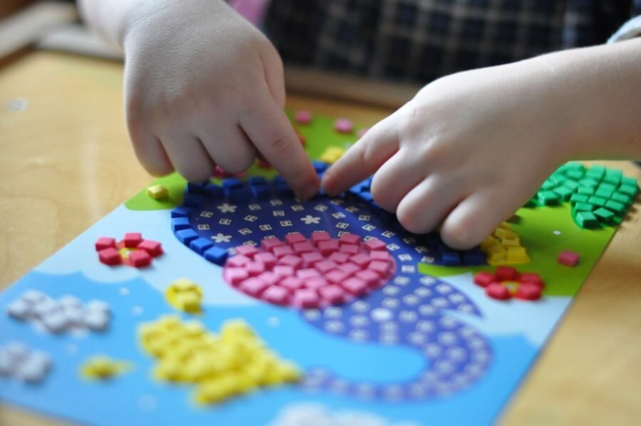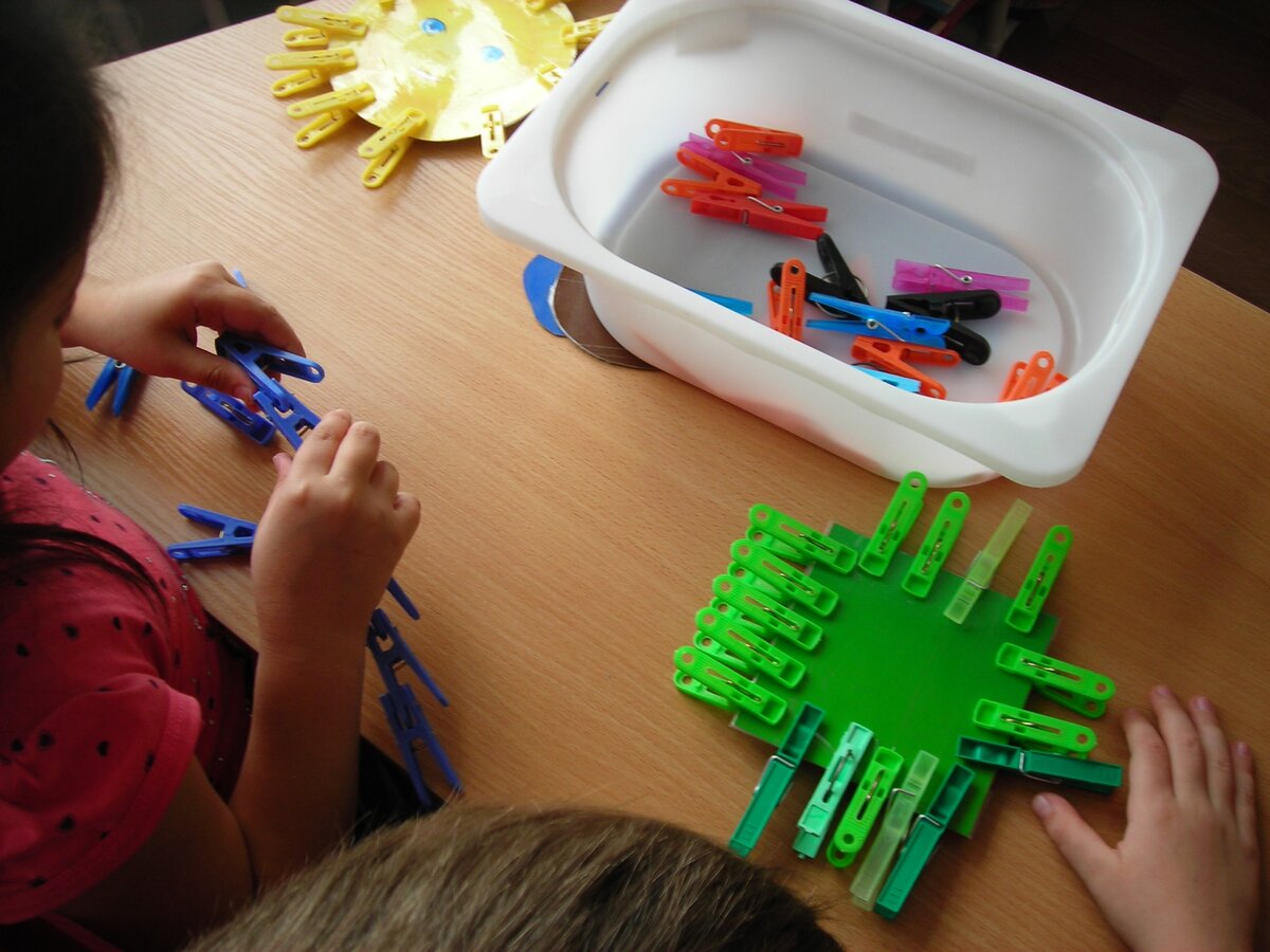 3. Берем из ванны прищепки и учим ребенка открывать ротик прищепки и цеплять её за лист картона. Из картона можно вырезать круг, а прищепки будут лучиками.