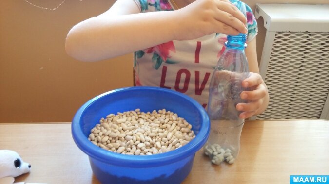 2. Берем пластиковую бутылку, идеально из под молока. В крышке делаем дырку. И бросаем по одной в бутылку горошинки и фасоль.