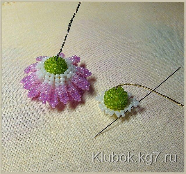 Прошить оставшиеся 2 ряда лепестков по 2-м следующим рядам мозаики, увеличивая длину лепестков на 1 пару бисерин в каждом ряду.