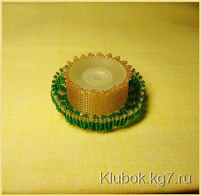 Колпачок для донышка обрезать до нужной высоты, тщательно выровнять и срезать в нём резьбу, чтоб болванка садилась на края донышка. Обшить бисером «Delika» мозаикой, по верхнему краю прошить зубчики из 3-х бисерин. Нижний край стянуть бисером 15 размера.