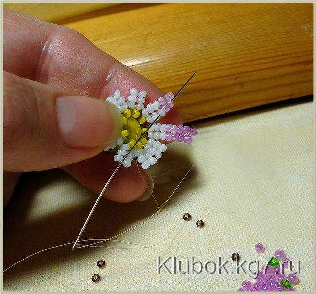 Чтоб букет не был однообразным, сделаем немного другие цветы. Обратное расположение бисера на лепестках и жёлтые бисерины вместо фиолетовых.