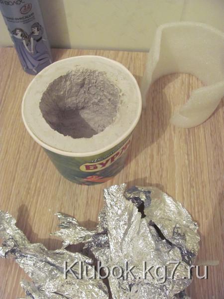Чтобы получить полое пространство нужно взять баллончик лака для волос и обмотать его фольгой.