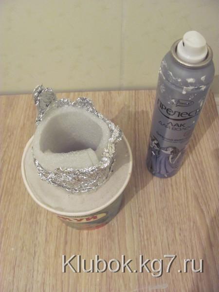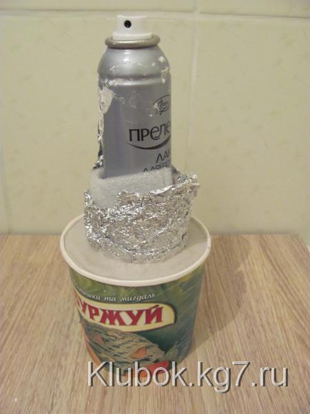 Чтобы получить полое пространство нужно взять баллончик лака для волос и обмотать его фольгой.