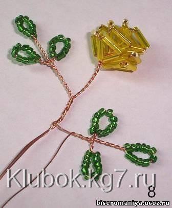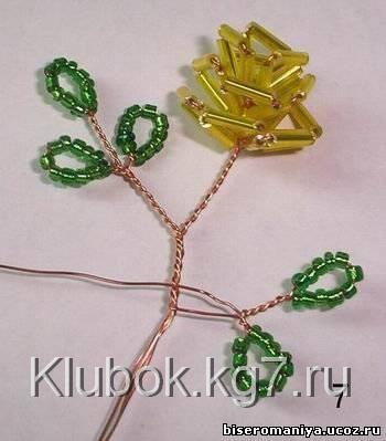 Получившуюся розочку отложим и сделаем на другой проволочке три петельки из зеленого бисера по 11 бисеринок, по форме напоминающей лист розы.