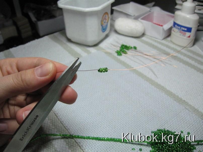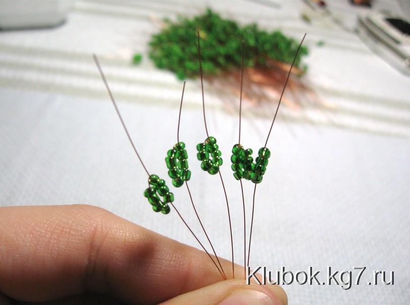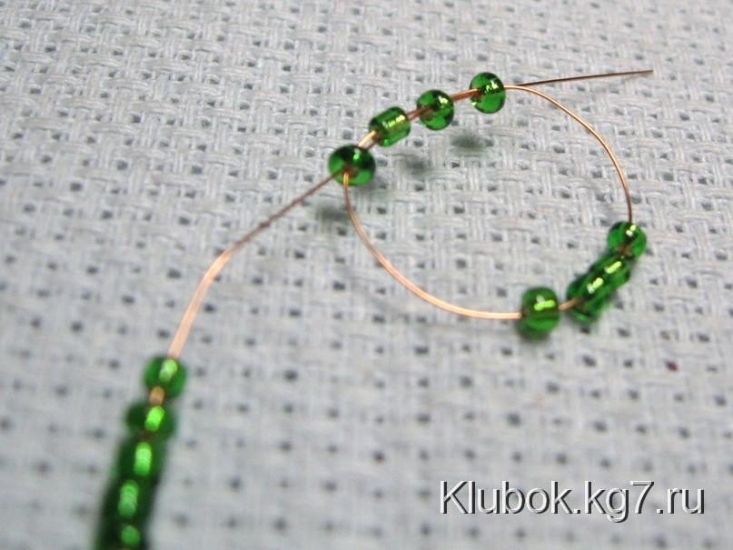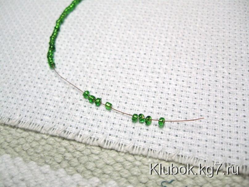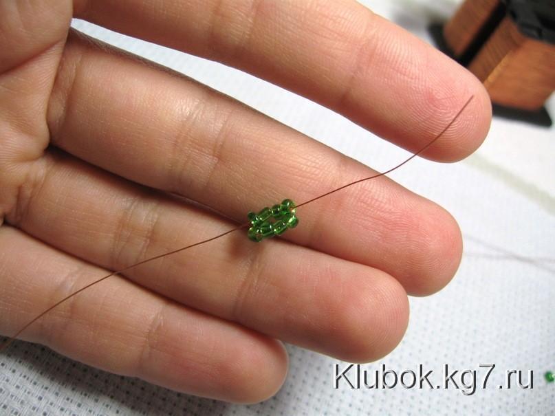 от мотка, набираем низку зеленого бисера, отсчитываем 4 +