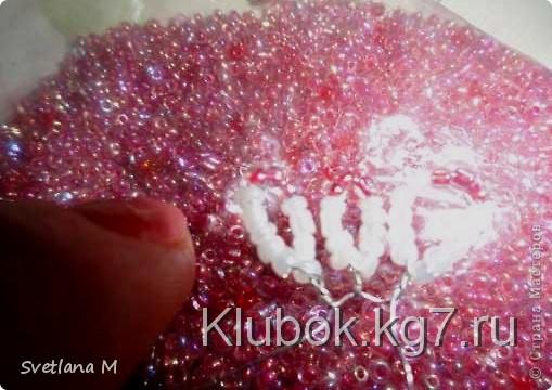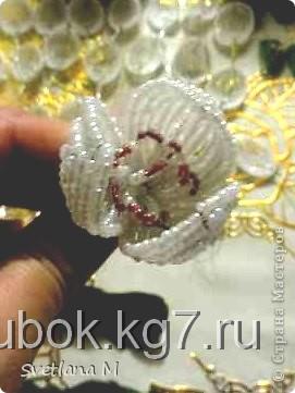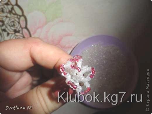 Начинаю плести серединку цветка-тычинки" петельной техникой":набираю 5 белых,3 розовых и опять 5 белых бисеринок.