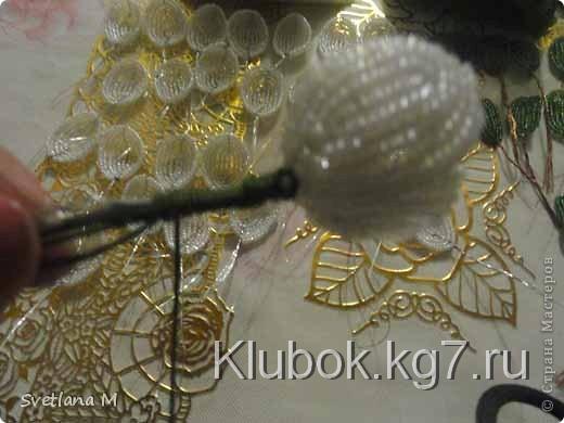 Делаем чашелистик подснежнику.Набираем зеленый бисер и обматываем БИСЕРНОЙ ниткОЙ у самого основания у подснежника.