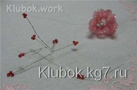 Теперь формируем сердцевину цветка. Для этого отрезаем проволоку длиной в 35 см, можно и покороче, если вы не хотите слишком пушистую сердцевину. Нанизываем на нее 3 бисерины красного цвета, затем перегибаем проволоку и начинаем закручивать. Длину тычинки обозначаем самостоятельно.