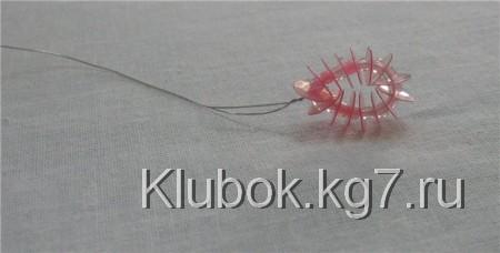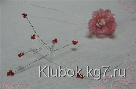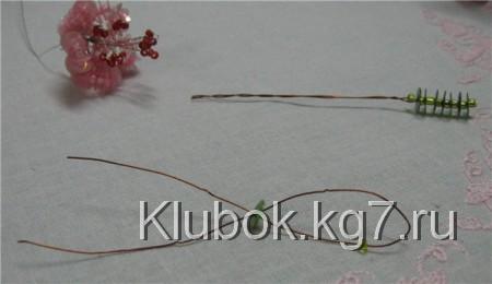 Теперь формируем сердцевину цветка. Для этого отрезаем проволоку длиной в 35 см, можно и покороче, если вы не хотите слишком пушистую сердцевину. Нанизываем на нее 3 бисерины красного цвета, затем перегибаем проволоку и начинаем закручивать. Длину тычинки обозначаем самостоятельно.