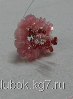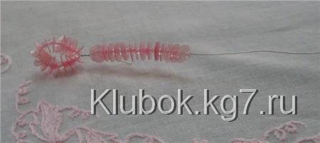 Начинаем нанизывать то же количество бисеринок и паеток дальше на проволоку. Это у нас будет второй лепесток для цветка.