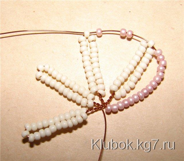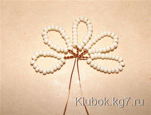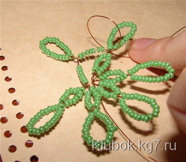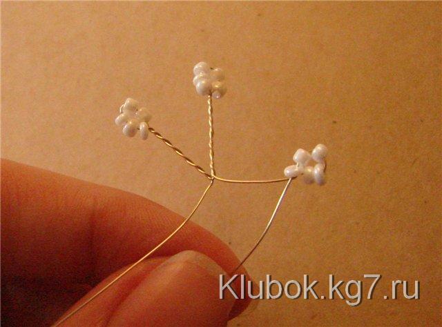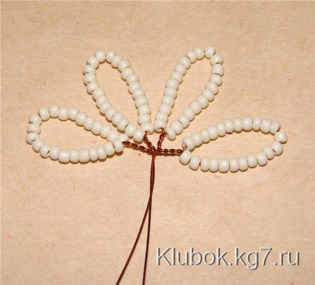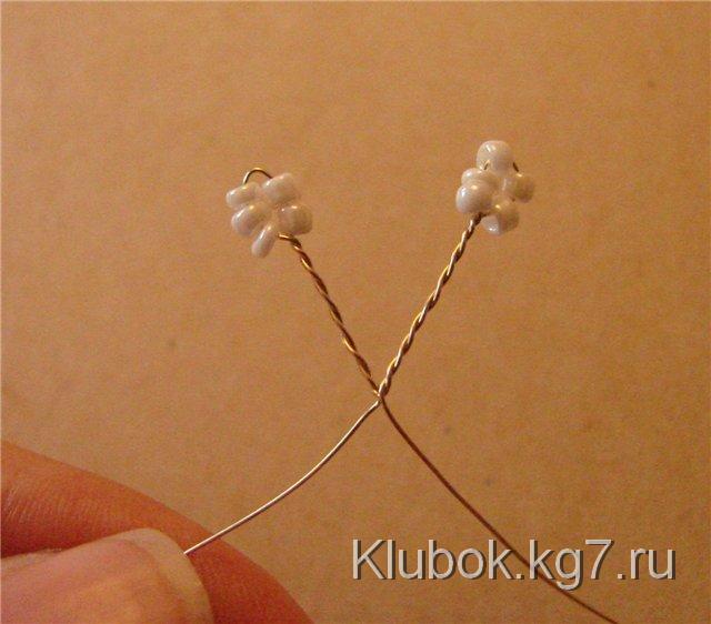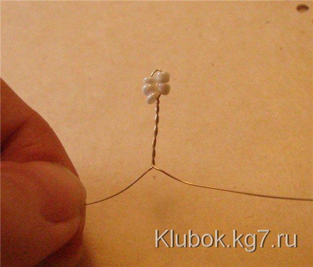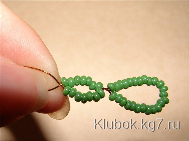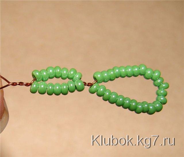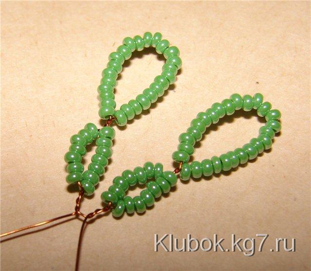 Повторяем все сначала (1 см бисера оставляем, из 2,5 (или 3) см делаем петельку и т.д), не забывайте оставлять проволочку, которая будет уходить на скрутку. Вот тут я показала, как это приблизительно делается