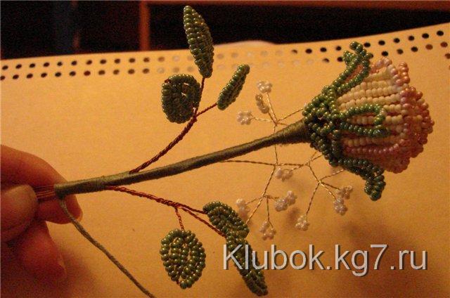 Обматываем до конца стебля, закрепляем нитки или флорленту, обрезаем.