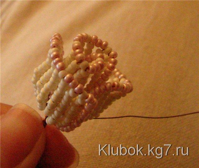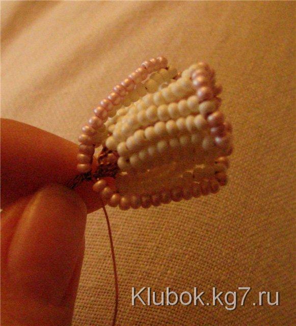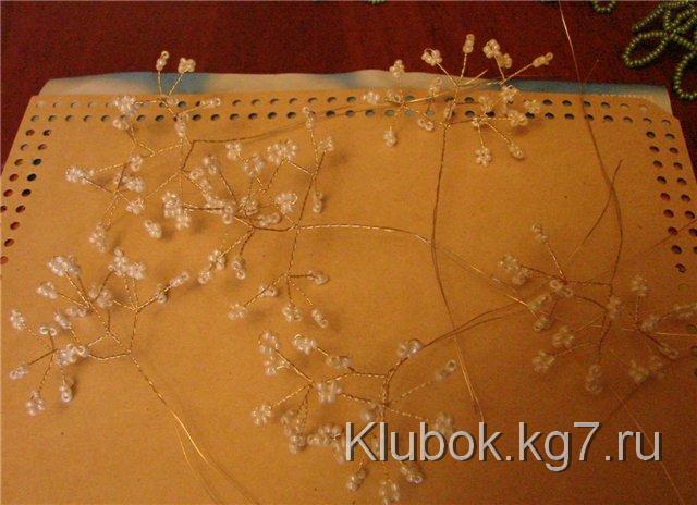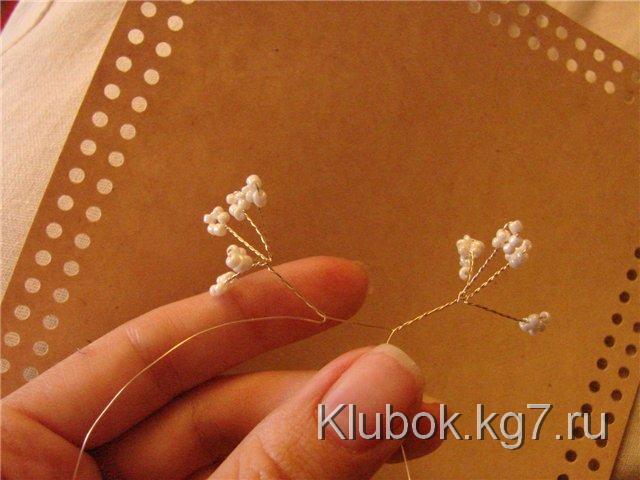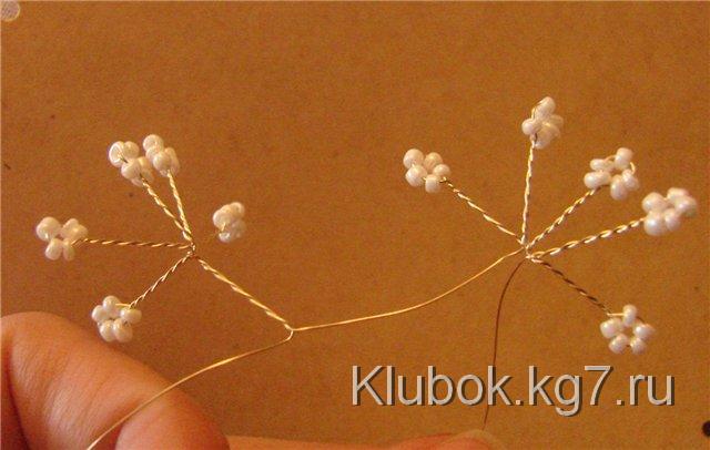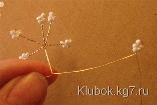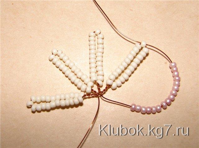 Берем проволоку, желательно серебристого или цвета светлого золота, делаем низку белого бисера.