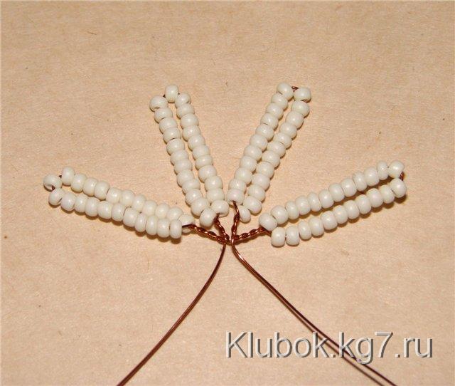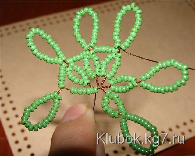 Огибаем низкой наши 4 бисеринки на оси, делаем полукруг, или дугу. Осевая проволочка сама как бы "обрежет" необходимое количество бисера. СЛЕДИМ, ЧТОБЫ ОСЕВАЯ ПРОВОЛОКА БЫЛА ПРЯМОЙ!