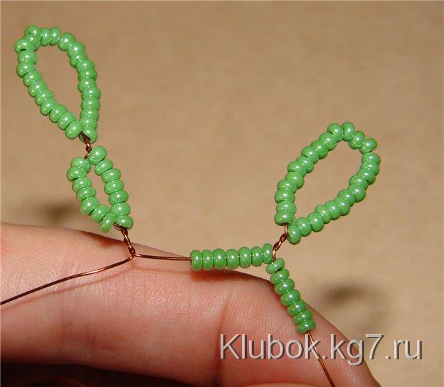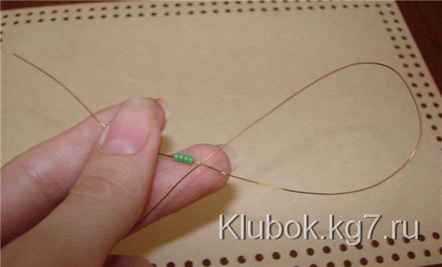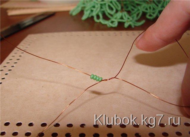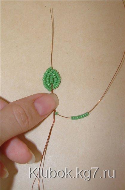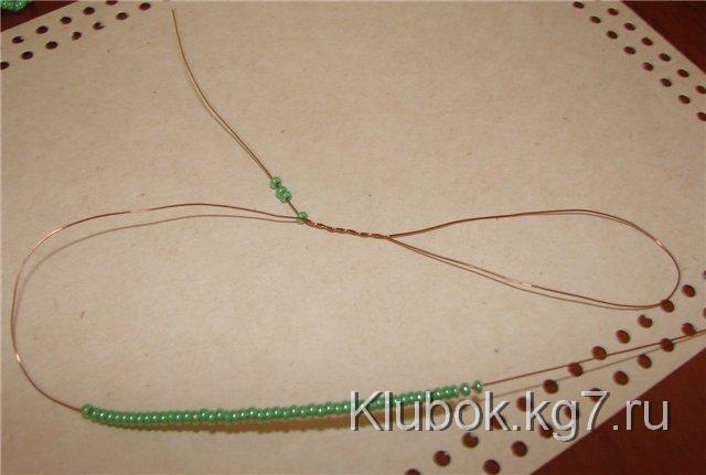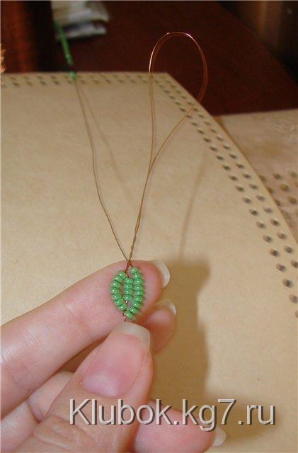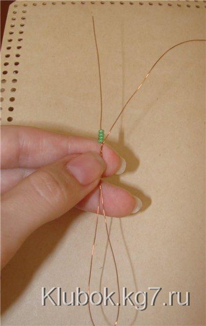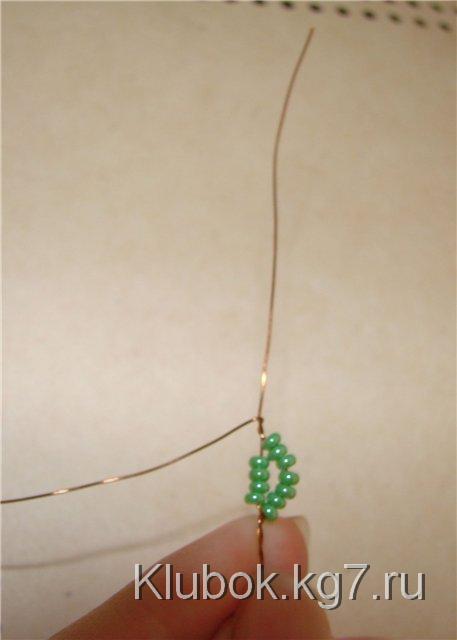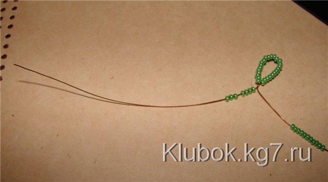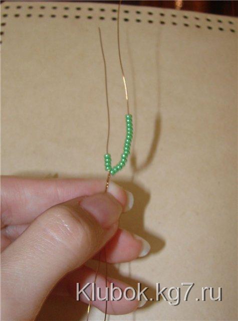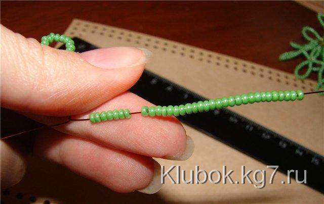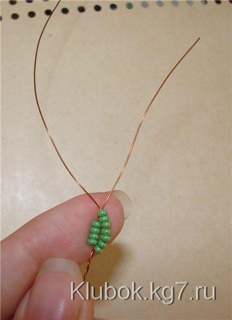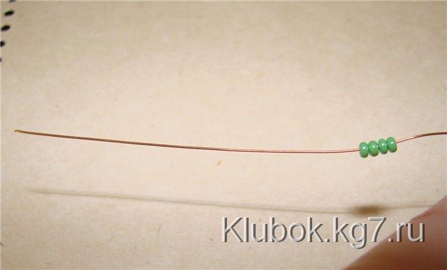 Берем низку зеленого бисера, отступаем около 7 см проволоки и берем от низки 4 бисерины