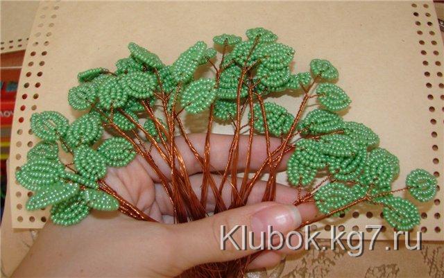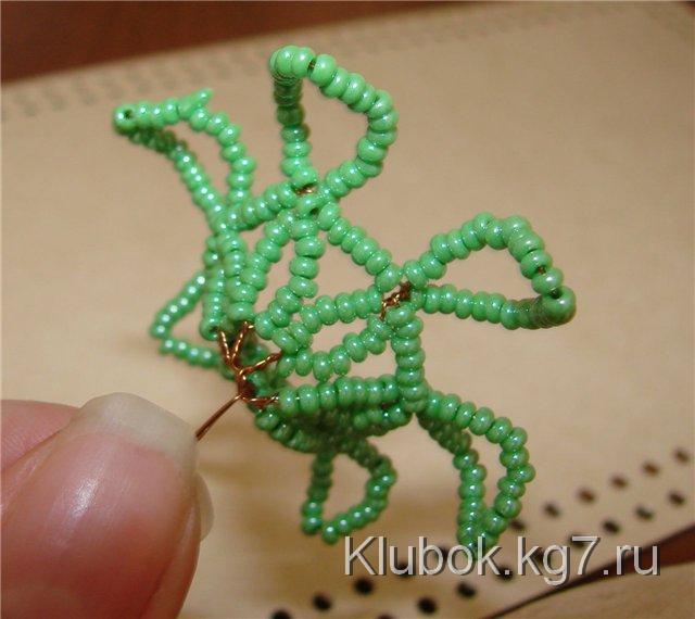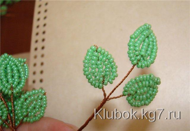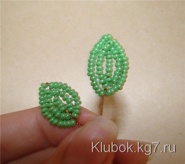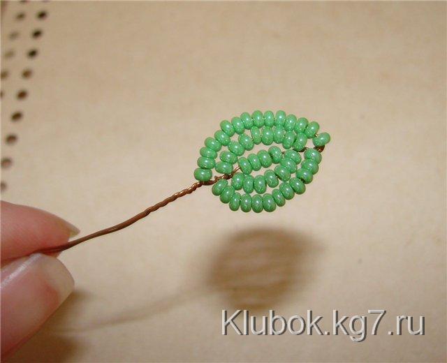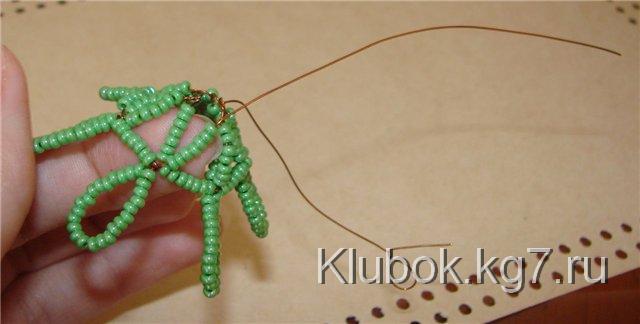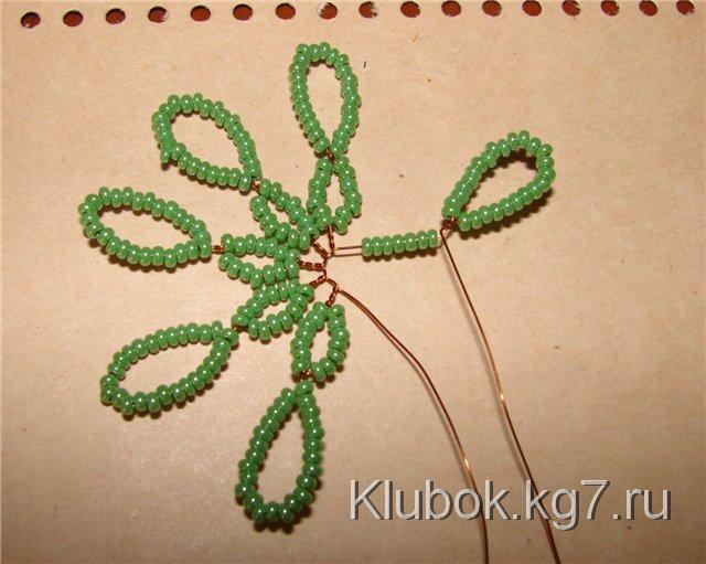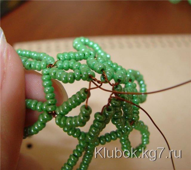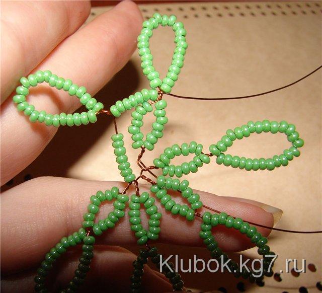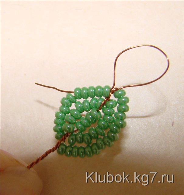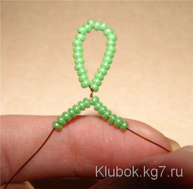 Берем низку зеленого бисера, отступаем около 7 см проволоки и берем от низки 4 бисерины