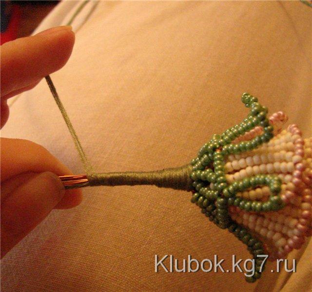 Теперь берем флорленту или нитки (у меня мулине) и начинаем обматывать наш "стебелек"