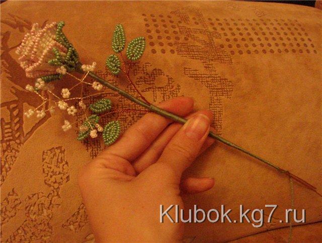Приблизительно через 5 см прикладываем нашу "мелочь" и приматываем её к стебельку