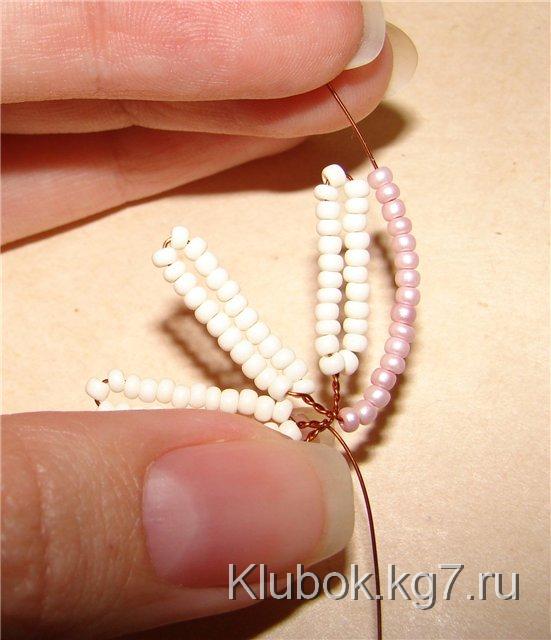 Делаем низку светлого бисера (ну или каким вы будете делать лепестки роз) Отступаем как обычно 15 см проволоки. Делаем 4 петельки на ножках 6-7 мм друг около дружки. Каждая петелька из низки 4 см