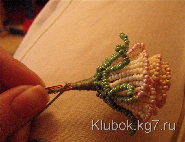 Теперь одеваем чашечку, плотненько прижимаем к лепесткам и прикручиваем проволокой
