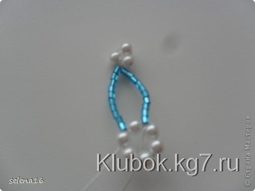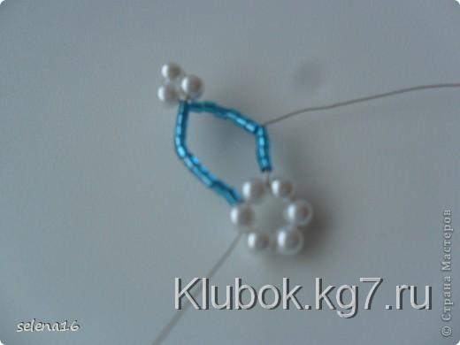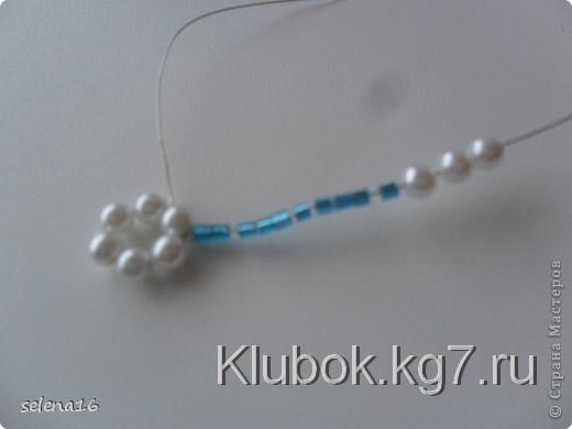 набираем дальше 10 бисерин и закрепляем второй лепесток,протаскиваем опять через 4 бисерины в верх и плетем таким образом до 6 лепестка