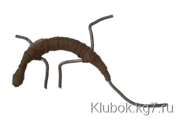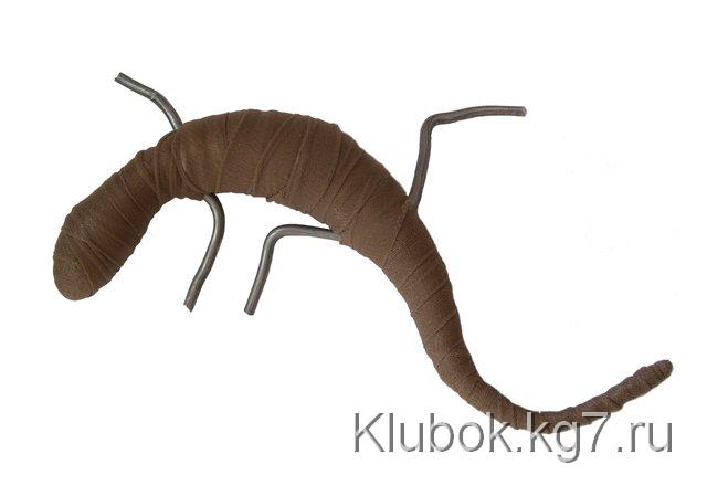 А такая вот поза фельзумы мне понравилась больше всего. Новичкам же советую плести свою ящерку без изгибов, то есть прямой. Потому что сложная форма тела накладывает определенные трудности в работу. Такой каркас получился у меня. Чтобы прикрепить будущие лапки к позвоночнику, я перетянула проволоку нитками, сделанными из капроновых колготок. Чтобы сделать нити, я отрезала сначала одну гачу и ножницами по кругу разрезала ее на нитку, шириной 2 сантиметра, затем ту же операцию проделала и с другой гачей (вот для этого то нам и нужны были хорошие острые большие хозяйственные ножницы, потому что плохие ножницы этот материал так просто не возьмут).
